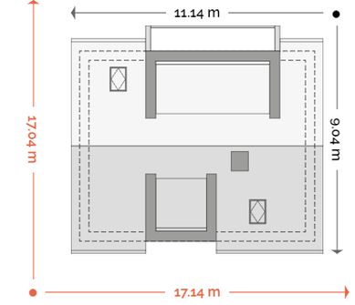 Graficzne opracowanie rzutów poglądowych widocznych na karcie projektu zostało wykonane przez Extradom.pl. Prezentowane przez Extradom.pl wizualizacje wykonane zostały przez autora projektu i należy poczytywać je jedynie za przykład i propozycję wykończenia, wizję architektoniczną autora projektu. Ostateczne wykończenie budynku może nastąpić na wiele sposobów. Szczegółowe rozwiązania zastosowane w oferowanej dokumentacji - w tym również ilość, lokalizacje i wygląd okien, drzwi, kominów - mogą w niewielkim stopniu różnić się od prezentowanej wizualizacji budynku.