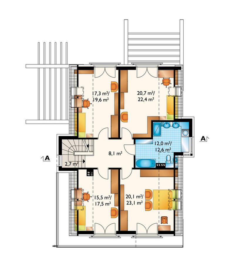 Graficzne opracowanie rzutów poglądowych widocznych na karcie projektu zostało wykonane przez Extradom.pl. Prezentowane przez Extradom.pl wizualizacje wykonane zostały przez autora projektu i należy poczytywać je jedynie za przykład i propozycję wykończenia, wizję architektoniczną autora projektu. Ostateczne wykończenie budynku może nastąpić na wiele sposobów. Szczegółowe rozwiązania zastosowane w oferowanej dokumentacji - w tym również ilość, lokalizacje i wygląd okien, drzwi, kominów - mogą w niewielkim stopniu różnić się od prezentowanej wizualizacji budynku.