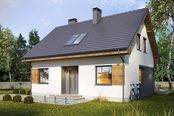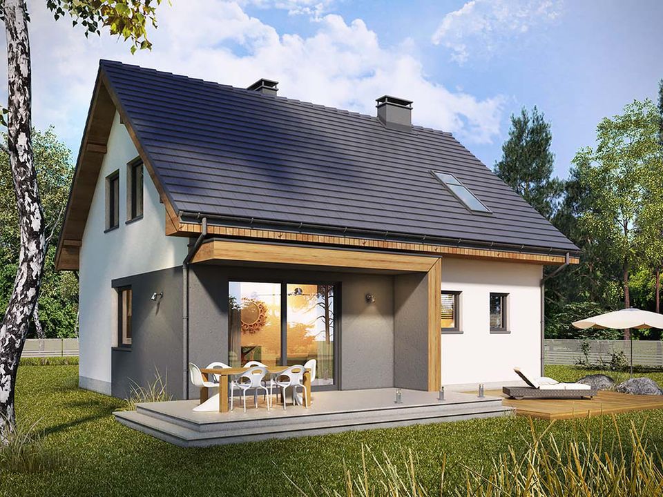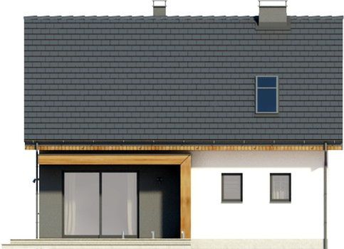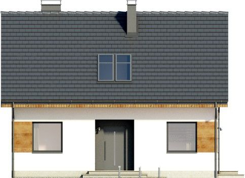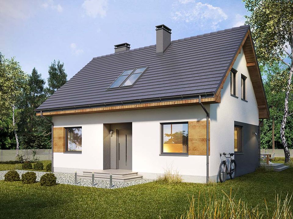 Zaproponowana przez nas technologia budowy domu to docieplone od zewnątrz styropianem ściany z bloczków gazobetonowych i strop gęstożebrowy typu Teriva. Dwuspadowy dach o drewnianej konstrukcji pokryty może być dachówką ceramiczną, albo cementową. Elewacje są w całości otynkowane.