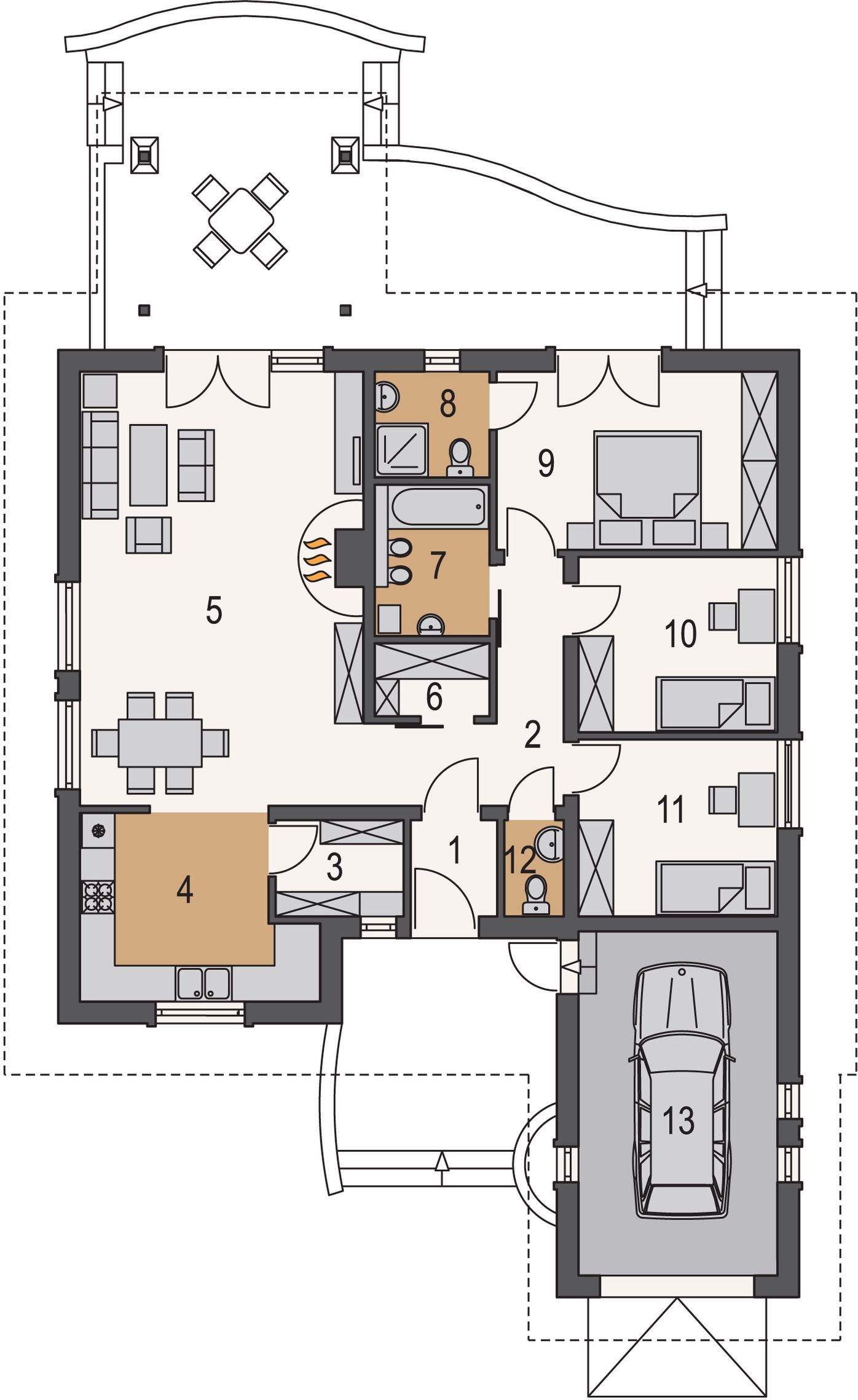 Graficzne opracowanie rzutów poglądowych widocznych na karcie projektu zostało wykonane przez Extradom.pl. Prezentowane przez Extradom.pl wizualizacje wykonane zostały przez autora projektu i należy poczytywać je jedynie za przykład i propozycję wykończenia, wizję architektoniczną autora projektu. Ostateczne wykończenie budynku może nastąpić na wiele sposobów. Szczegółowe rozwiązania zastosowane w oferowanej dokumentacji - w tym również ilość, lokalizacje i wygląd okien, drzwi, kominów - mogą w niewielkim stopniu różnić się od prezentowanej wizualizacji budynku.