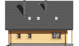 Wysokość ścianki kolankowej: 0.97 m. Strop: drewniany. Pokrycie dachu: dachówka gontopodobna Gerard Corona. Ściany zewnętrzne: płazy drewniane + wełna mineralna + deska. Ściany wewnętrzne: płazy drewniane. Typ ogrzewania: kocioł gazowy lub kocioł na paliwo stałe. Instalacje dodatkowe: instalacja solarna. Inne: okna połaciowe Fakro, brama garażowa Hörmann.