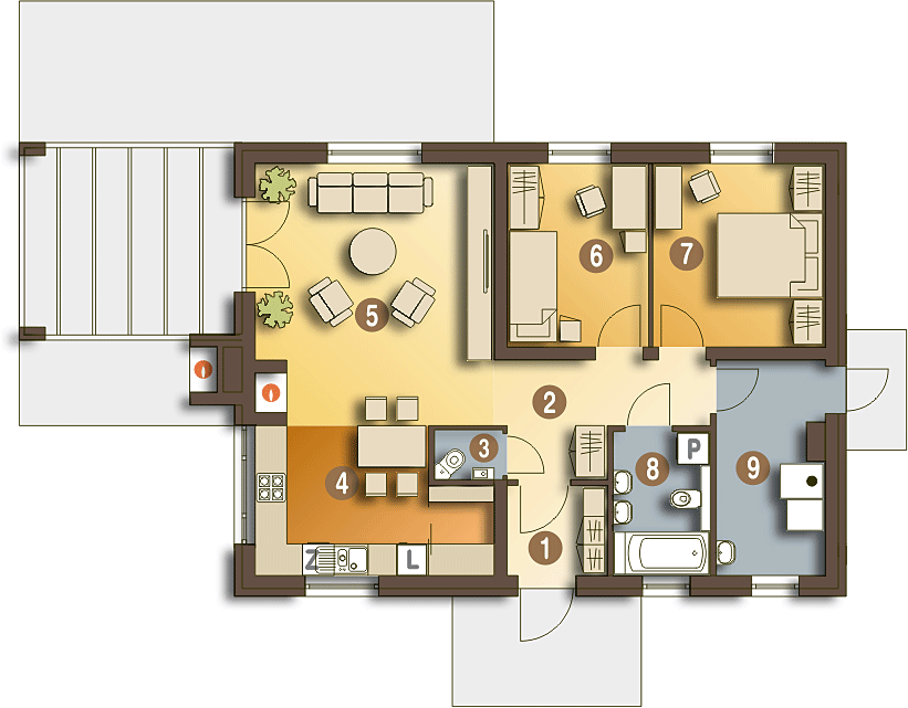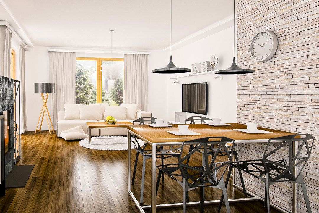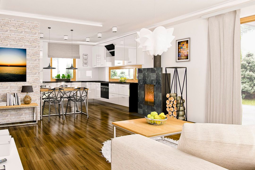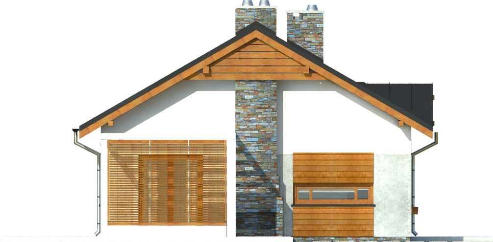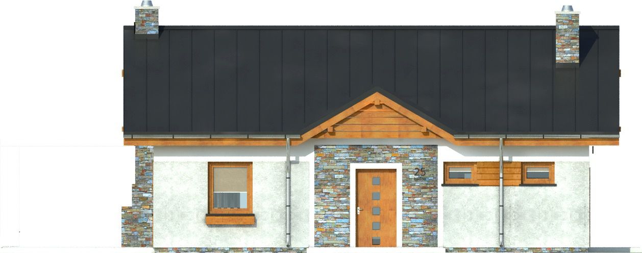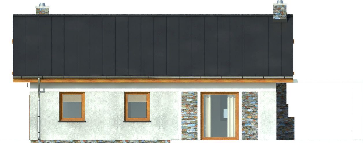 Graficzne opracowanie rzutów poglądowych widocznych na karcie projektu zostało wykonane przez Extradom.pl. Prezentowane przez Extradom.pl wizualizacje wykonane zostały przez autora projektu i należy poczytywać je jedynie za przykład i propozycję wykończenia, wizję architektoniczną autora projektu. Ostateczne wykończenie budynku może nastąpić na wiele sposobów. Szczegółowe rozwiązania zastosowane w oferowanej dokumentacji - w tym również ilość, lokalizacje i wygląd okien, drzwi, kominów - mogą w niewielkim stopniu różnić się od prezentowanej wizualizacji budynku.