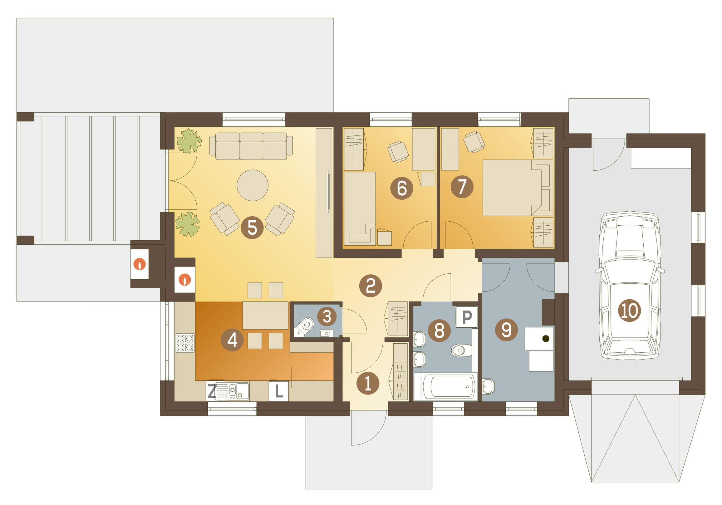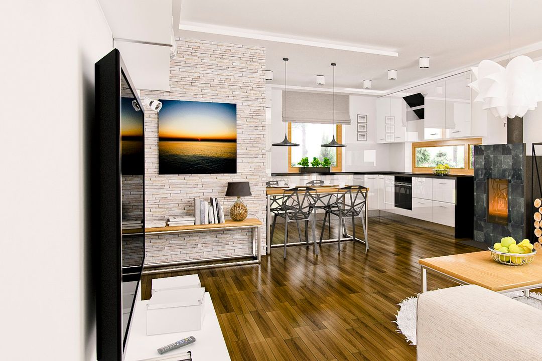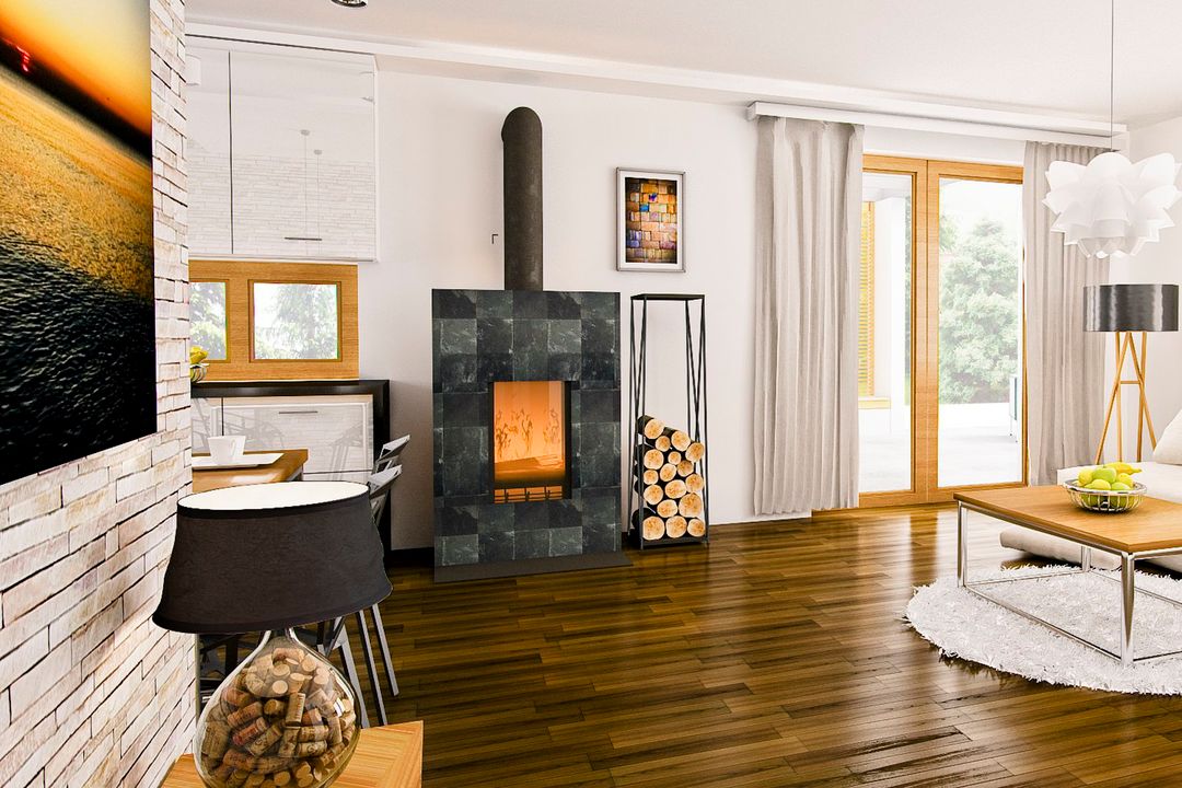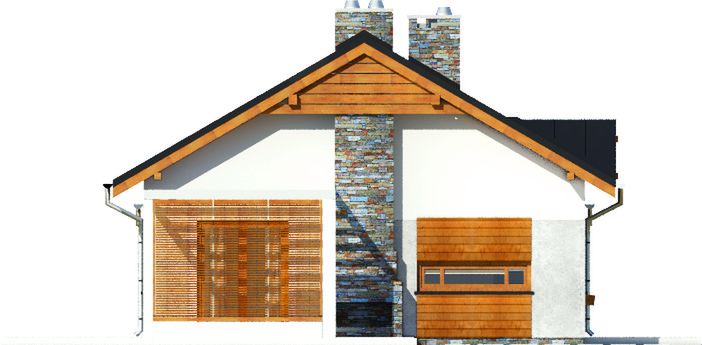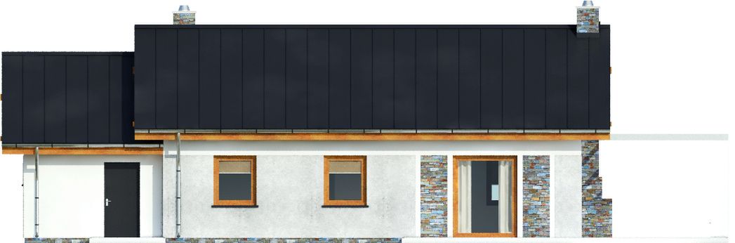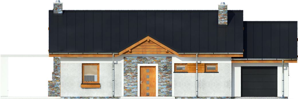 Graficzne opracowanie rzutów poglądowych widocznych na karcie projektu zostało wykonane przez Extradom.pl. Prezentowane przez Extradom.pl wizualizacje wykonane zostały przez autora projektu i należy poczytywać je jedynie za przykład i propozycję wykończenia, wizję architektoniczną autora projektu. Ostateczne wykończenie budynku może nastąpić na wiele sposobów. Szczegółowe rozwiązania zastosowane w oferowanej dokumentacji - w tym również ilość, lokalizacje i wygląd okien, drzwi, kominów - mogą w niewielkim stopniu różnić się od prezentowanej wizualizacji budynku.