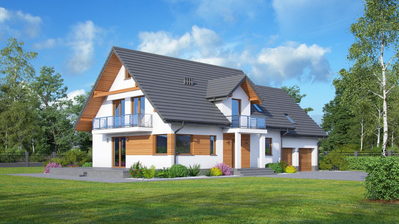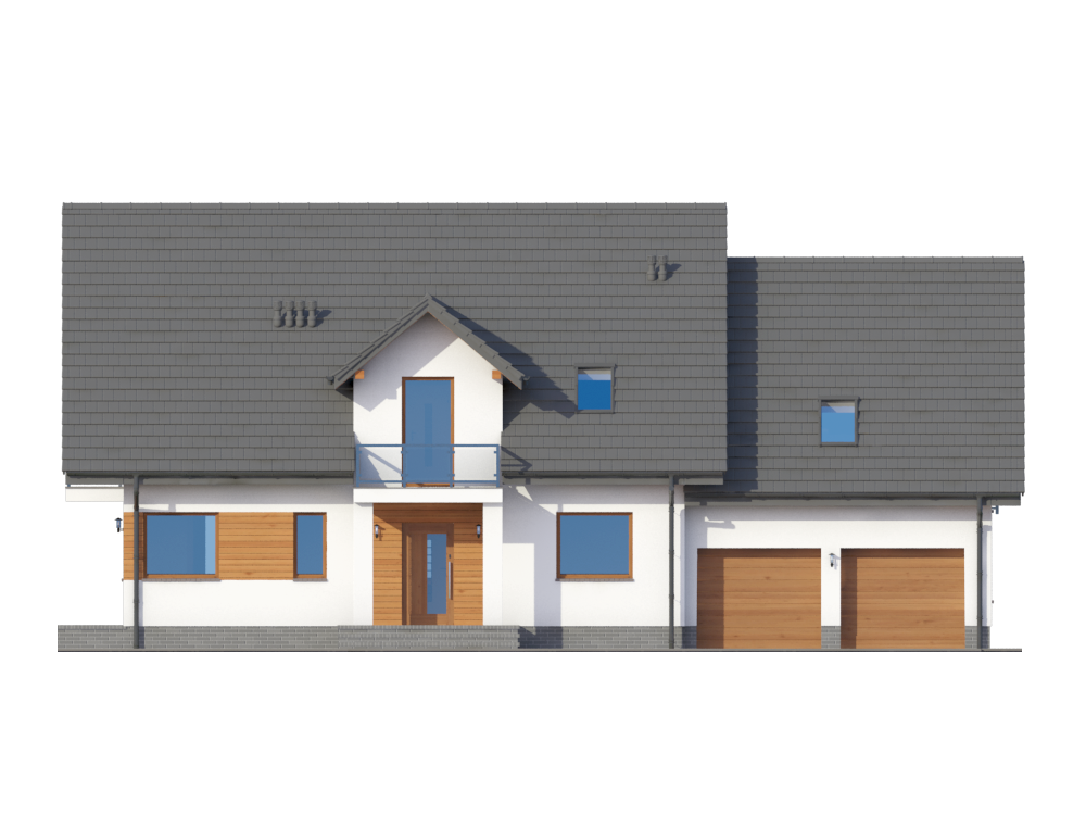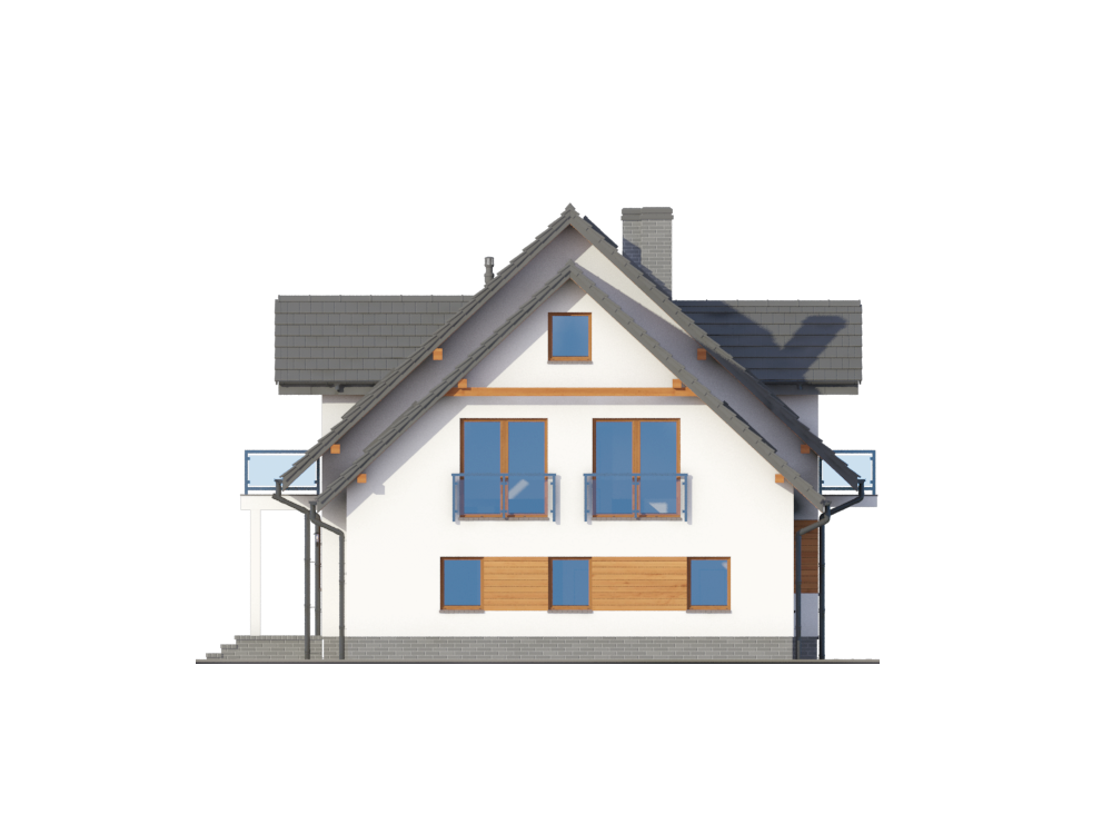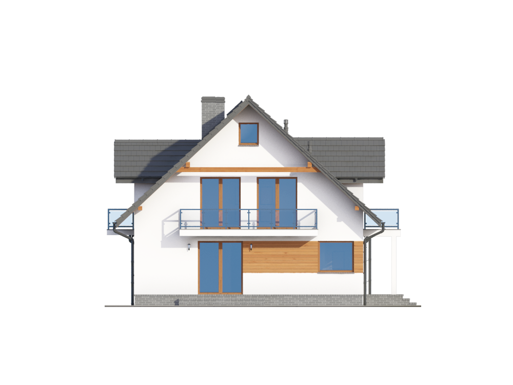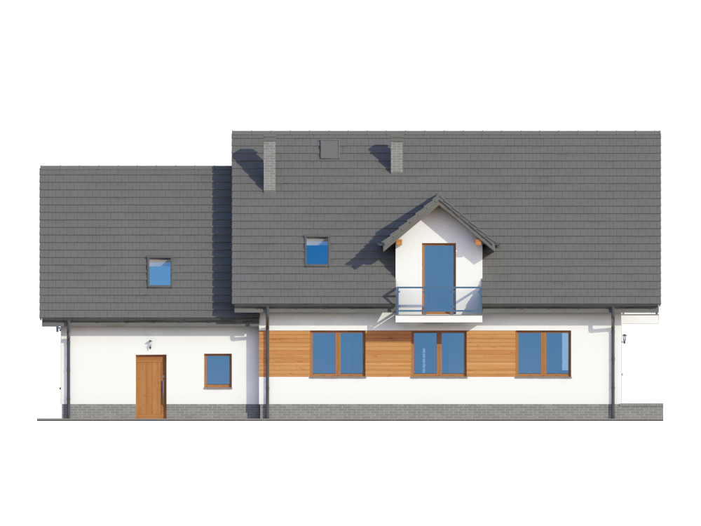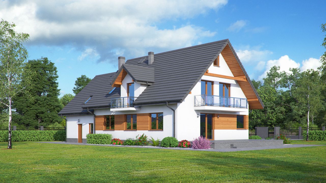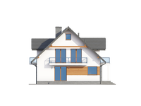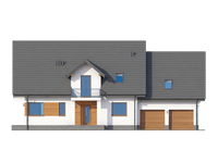 Graficzne opracowanie rzutów poglądowych widocznych na karcie projektu zostało wykonane przez Extradom.pl. Prezentowane przez Extradom.pl wizualizacje wykonane zostały przez autora projektu i należy poczytywać je jedynie za przykład i propozycję wykończenia, wizję architektoniczną autora projektu. Ostateczne wykończenie budynku może nastąpić na wiele sposobów. Szczegółowe rozwiązania zastosowane w oferowanej dokumentacji - w tym również ilość, lokalizacje i wygląd okien, drzwi, kominów - mogą w niewielkim stopniu różnić się od prezentowanej wizualizacji budynku.