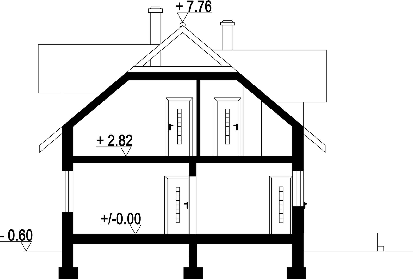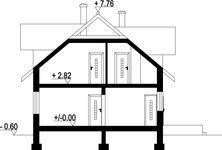 Wysokość ścianki kolankowej: 1.09 m. Strop: płyta żelbetowa. Pokrycie dachu: dachówka ceramiczna. Ściany zewnętrzne: pustaki ceramiczne + styropian. Ściany wewnętrzne: pustaki ceramiczne. Typ ogrzewania: kocioł gazowy lub kocioł na paliwo stałe. Inne: okna połaciowe Fakro.