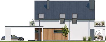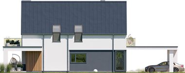 Graficzne opracowanie rzutów poglądowych widocznych na karcie projektu zostało wykonane przez Extradom.pl. Prezentowane przez Extradom.pl wizualizacje wykonane zostały przez autora projektu i należy poczytywać je jedynie za przykład i propozycję wykończenia, wizję architektoniczną autora projektu. Ostateczne wykończenie budynku może nastąpić na wiele sposobów. Szczegółowe rozwiązania zastosowane w oferowanej dokumentacji - w tym również ilość, lokalizacje i wygląd okien, drzwi, kominów - mogą w niewielkim stopniu różnić się od prezentowanej wizualizacji budynku.