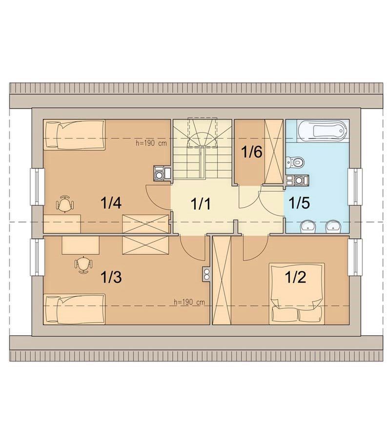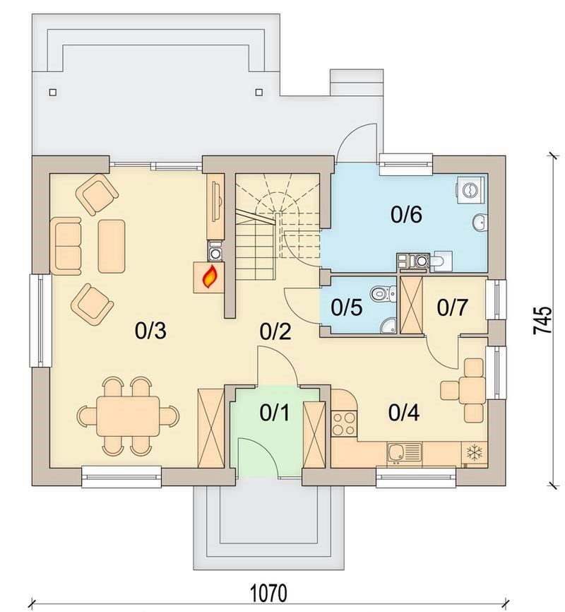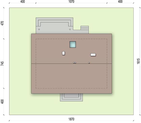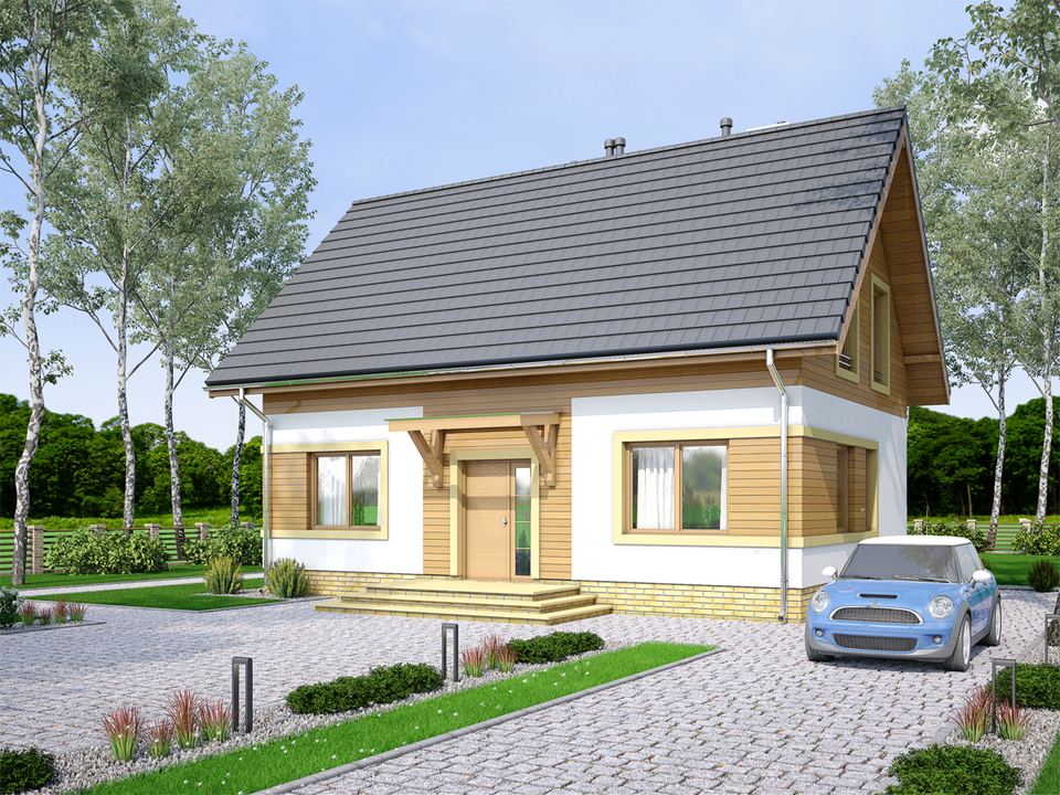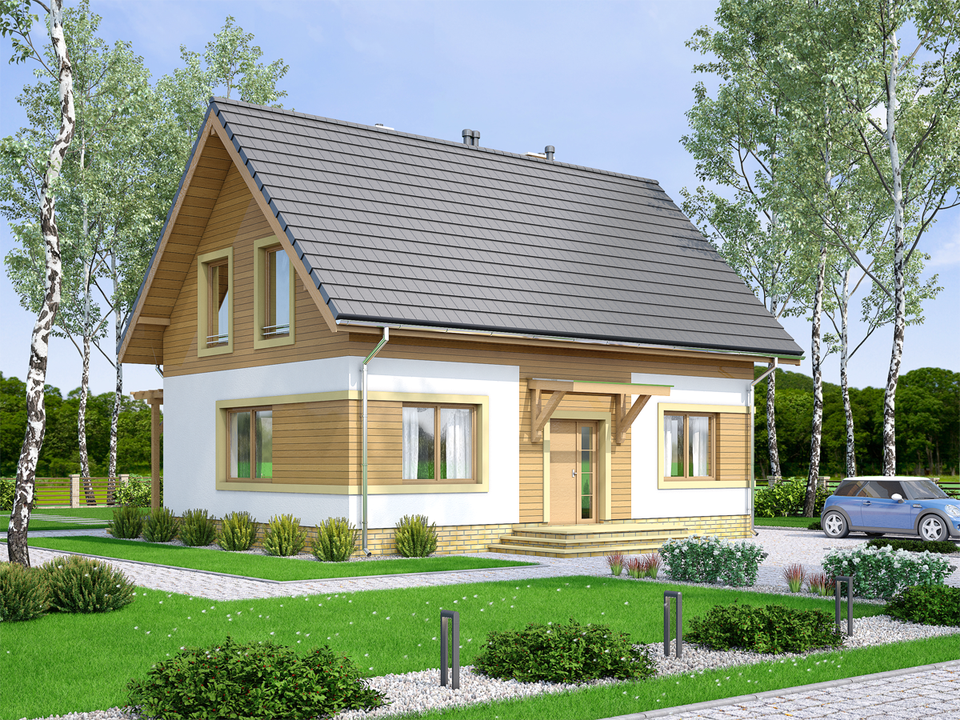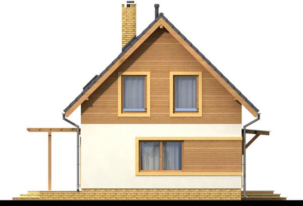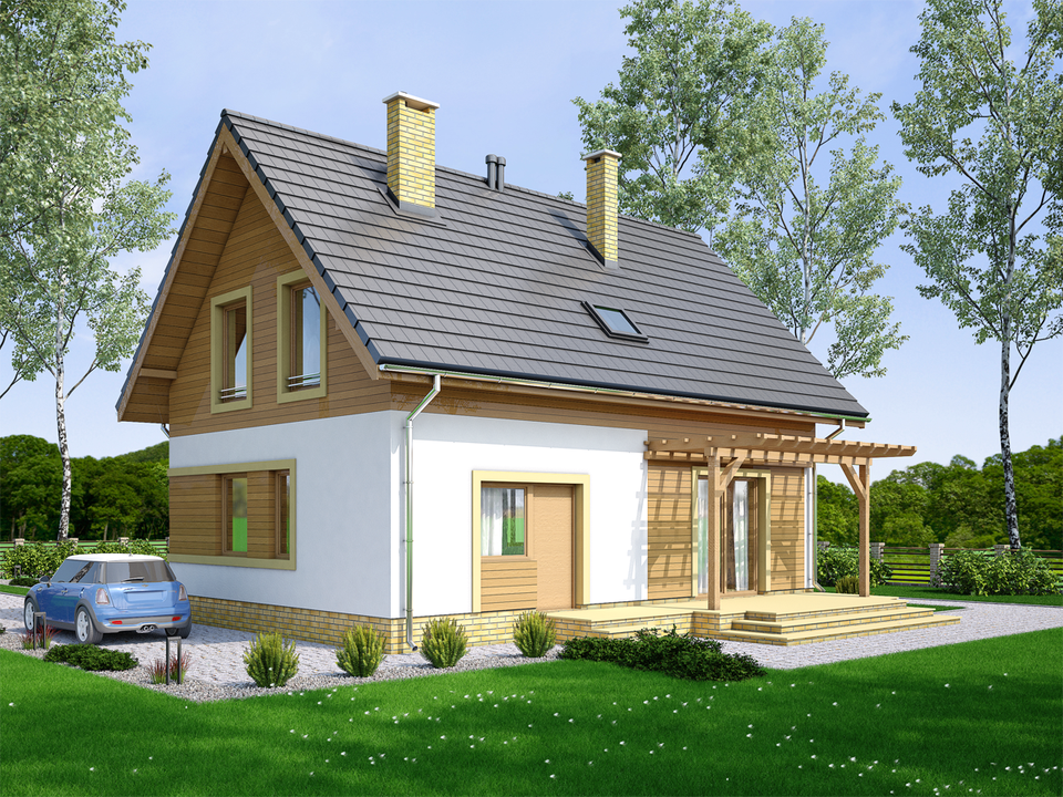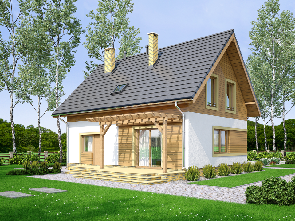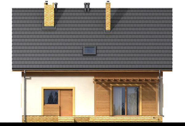 Graficzne opracowanie rzutów poglądowych widocznych na karcie projektu zostało wykonane przez Extradom.pl. Prezentowane przez Extradom.pl wizualizacje wykonane zostały przez autora projektu i należy poczytywać je jedynie za przykład i propozycję wykończenia, wizję architektoniczną autora projektu. Ostateczne wykończenie budynku może nastąpić na wiele sposobów. Szczegółowe rozwiązania zastosowane w oferowanej dokumentacji - w tym również ilość, lokalizacje i wygląd okien, drzwi, kominów - mogą w niewielkim stopniu różnić się od prezentowanej wizualizacji budynku.