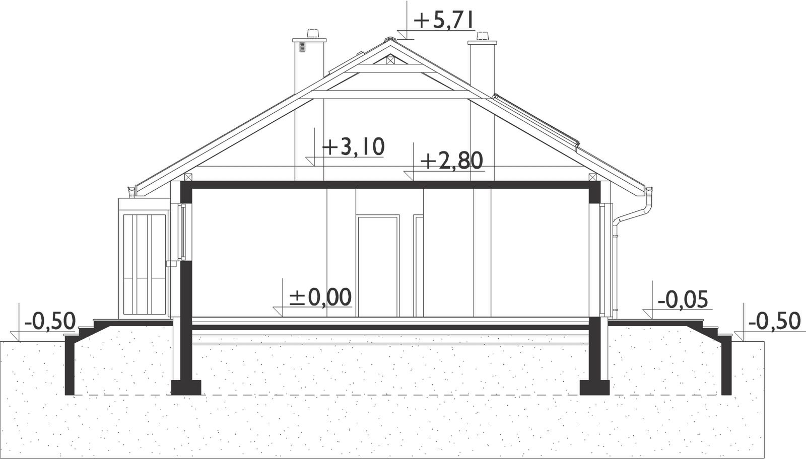 Wersja technologiczna: murowana - beton komórkowy. Strop: żelbetowy monolityczny. Typ schodów: brak. Konstrukcja dachu: drewniana krokwiowo-jętkowa. Typ ogrzewania: Kocioł na gaz. Dostępna wersja z pompą ciepła: Tak. Wentylacja: mechaniczna. Ściany zewnętrzne: 24 cm beton komórkowy. Ściany wewnętrzne: 24 cm beton komórkowy. Ściany wewnętrzne działowe: 12 cm beton komórkowy. Wentylacja: mechaniczna.