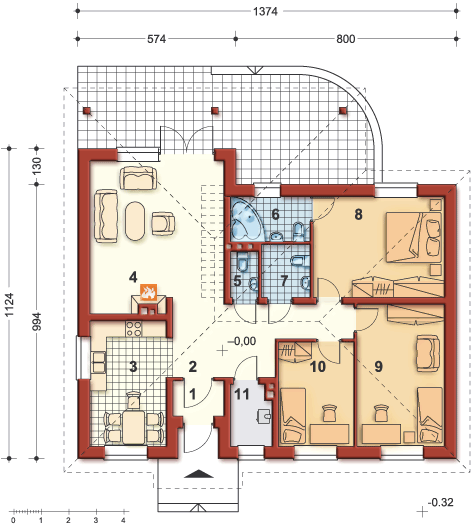 Graficzne opracowanie rzutów poglądowych widocznych na karcie projektu zostało wykonane przez Extradom.pl. Prezentowane przez Extradom.pl wizualizacje wykonane zostały przez autora projektu i należy poczytywać je jedynie za przykład i propozycję wykończenia, wizję architektoniczną autora projektu. Ostateczne wykończenie budynku może nastąpić na wiele sposobów. Szczegółowe rozwiązania zastosowane w oferowanej dokumentacji - w tym również ilość, lokalizacje i wygląd okien, drzwi, kominów - mogą w niewielkim stopniu różnić się od prezentowanej wizualizacji budynku.