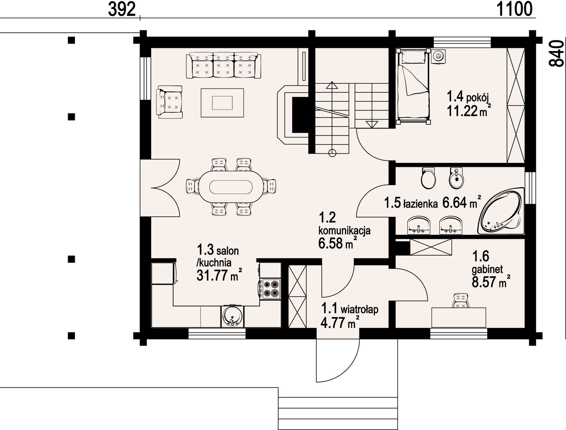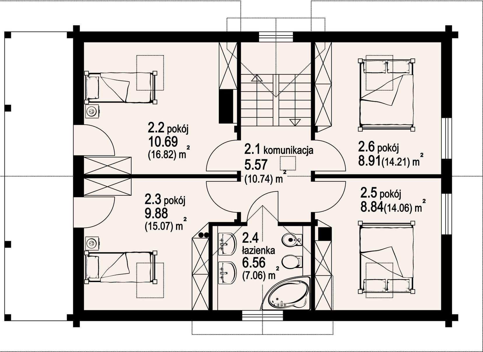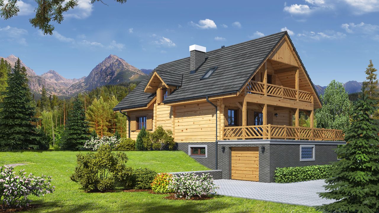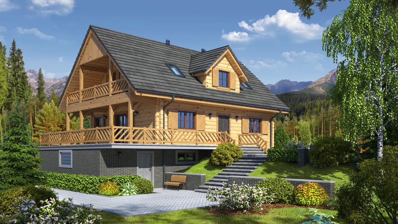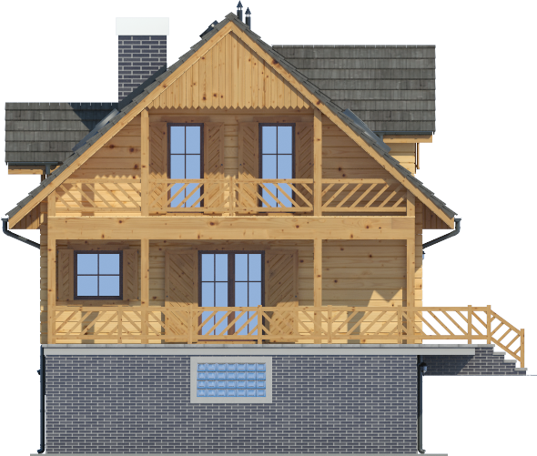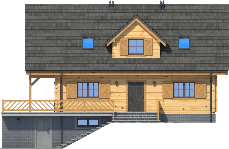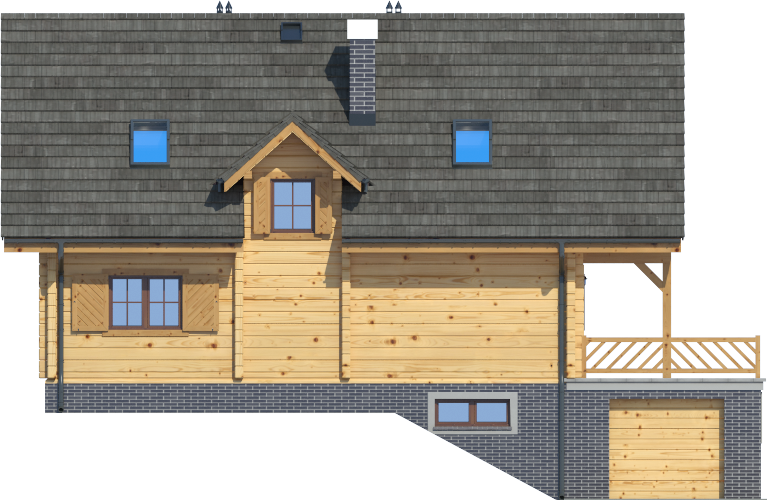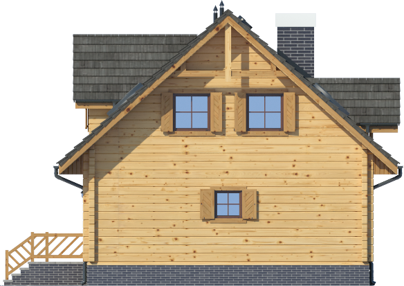 Wysokość ścianki kolankowej: 0.58 m. Ilość drewna na więźbę: 10 m³. Strop: drewniany. Pokrycie dachu: dachówka gontopodobna z posypką Gerard Corona. Ściany zewnętrzne: płazy drewniane + wełna mineralna + deska. Ściany wewnętrzne: płazy drewniane. Typ ogrzewania: kocioł gazowy lub kocioł na paliwo stałe. Instalacje dodatkowe: pompa ciepła, pompa ciepła. Inne: okna połaciowe Velux.