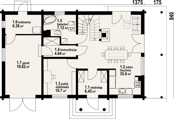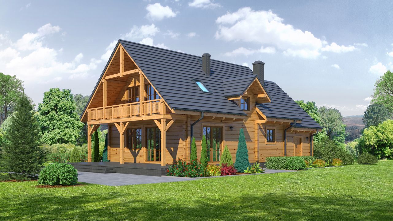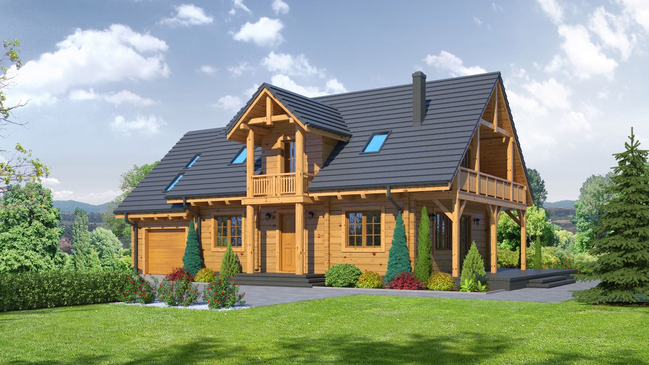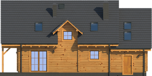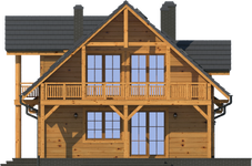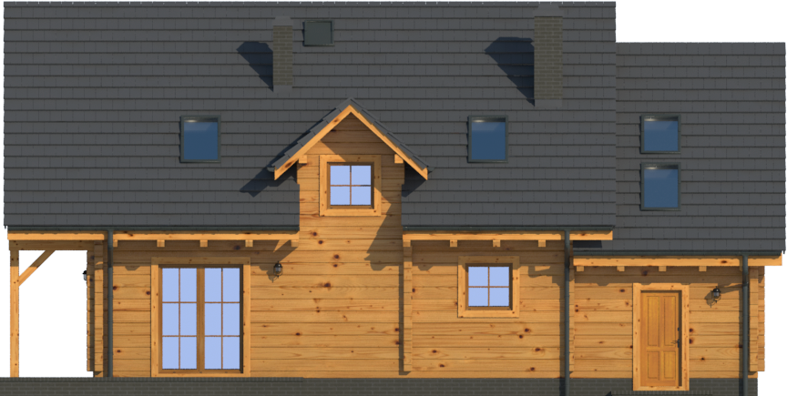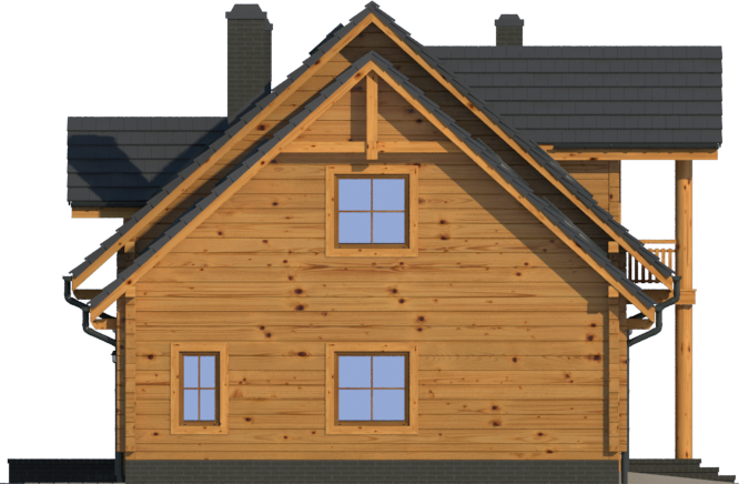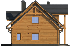 Wysokość ścianki kolankowej: 0.84 m. Strop: drewniany. Pokrycie dachu: dachówka gontopodobna Gerard Corona. Ściany zewnętrzne: płazy drewniane + wełna mineralna + deska. Ściany wewnętrzne: płazy drewniane. Typ ogrzewania: kocioł gazowy lub kocioł na paliwo stałe. Inne: okna połaciowe Fakro.