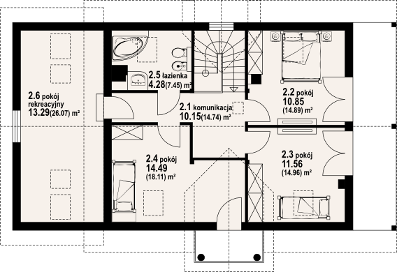 Graficzne opracowanie rzutów poglądowych widocznych na karcie projektu zostało wykonane przez Extradom.pl. Prezentowane przez Extradom.pl wizualizacje wykonane zostały przez autora projektu i należy poczytywać je jedynie za przykład i propozycję wykończenia, wizję architektoniczną autora projektu. Ostateczne wykończenie budynku może nastąpić na wiele sposobów. Szczegółowe rozwiązania zastosowane w oferowanej dokumentacji - w tym również ilość, lokalizacje i wygląd okien, drzwi, kominów - mogą w niewielkim stopniu różnić się od prezentowanej wizualizacji budynku.