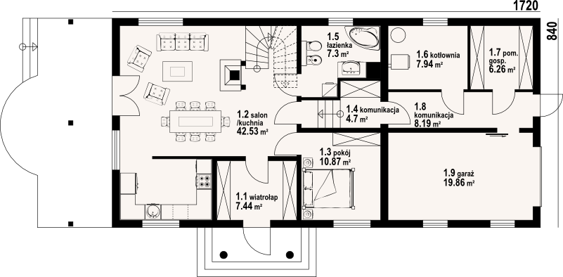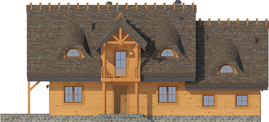 Graficzne opracowanie rzutów poglądowych widocznych na karcie projektu zostało wykonane przez Extradom.pl. Prezentowane przez Extradom.pl wizualizacje wykonane zostały przez autora projektu i należy poczytywać je jedynie za przykład i propozycję wykończenia, wizję architektoniczną autora projektu. Ostateczne wykończenie budynku może nastąpić na wiele sposobów. Szczegółowe rozwiązania zastosowane w oferowanej dokumentacji - w tym również ilość, lokalizacje i wygląd okien, drzwi, kominów - mogą w niewielkim stopniu różnić się od prezentowanej wizualizacji budynku.