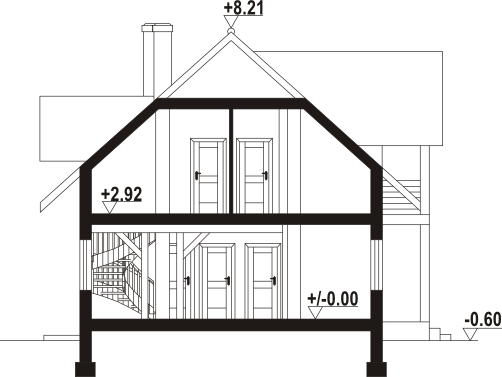 Wysokość ścianki kolankowej: 1.2 m. Strop: drewniany. Pokrycie dachu: dachówka gontopodobna Gerard Corona. Ściany zewnętrzne: szkieletowe drewniane ocieplone wełną mineralną. Ściany wewnętrzne: szkieletowe drewniane. Typ ogrzewania: kocioł na paliwo stałe.