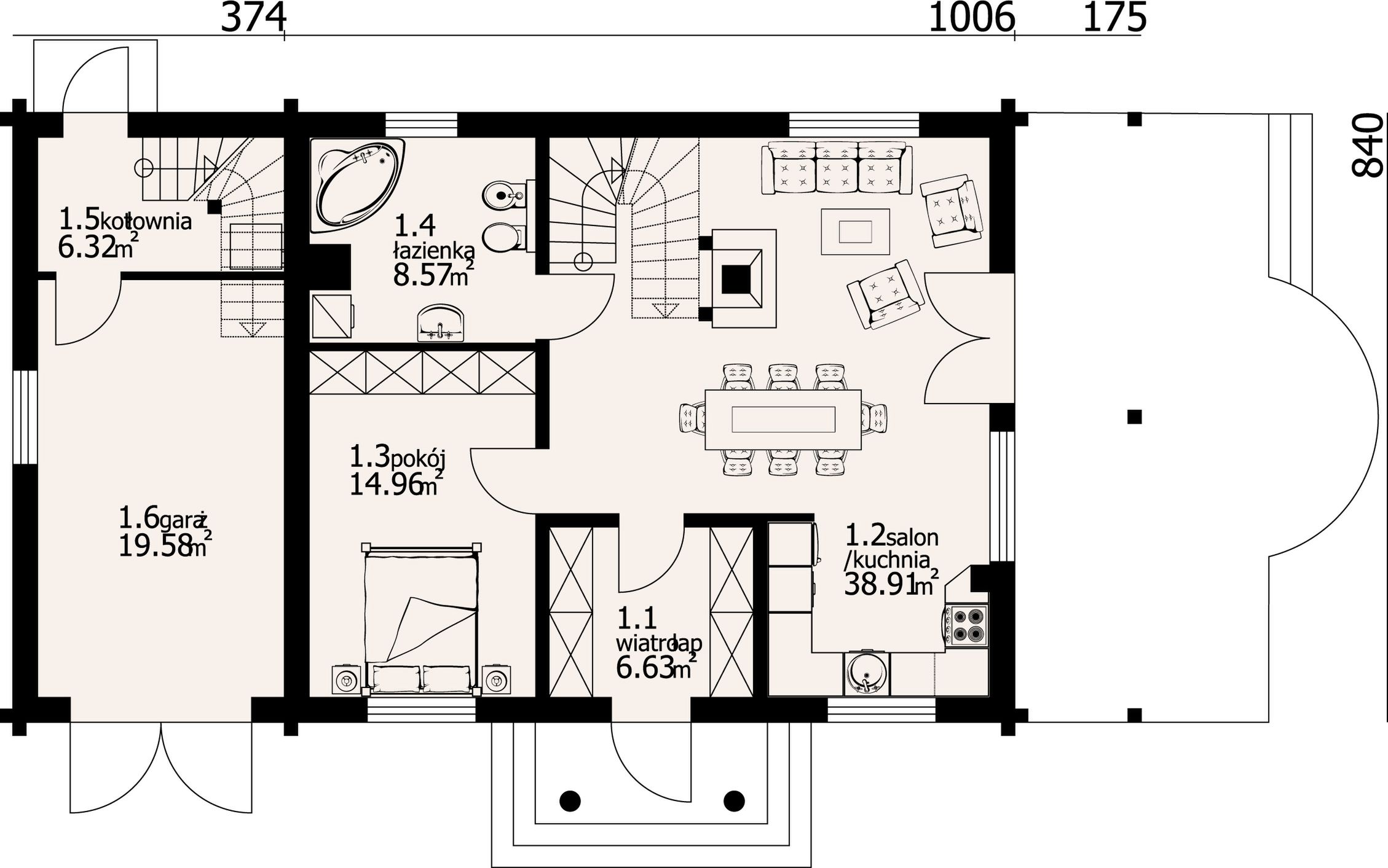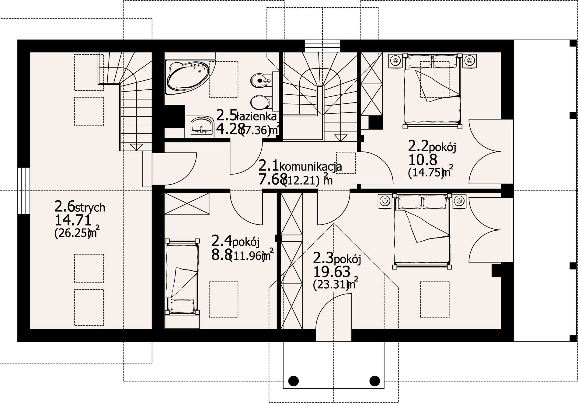 Graficzne opracowanie rzutów poglądowych widocznych na karcie projektu zostało wykonane przez Extradom.pl. Prezentowane przez Extradom.pl wizualizacje wykonane zostały przez autora projektu i należy poczytywać je jedynie za przykład i propozycję wykończenia, wizję architektoniczną autora projektu. Ostateczne wykończenie budynku może nastąpić na wiele sposobów. Szczegółowe rozwiązania zastosowane w oferowanej dokumentacji - w tym również ilość, lokalizacje i wygląd okien, drzwi, kominów - mogą w niewielkim stopniu różnić się od prezentowanej wizualizacji budynku.
