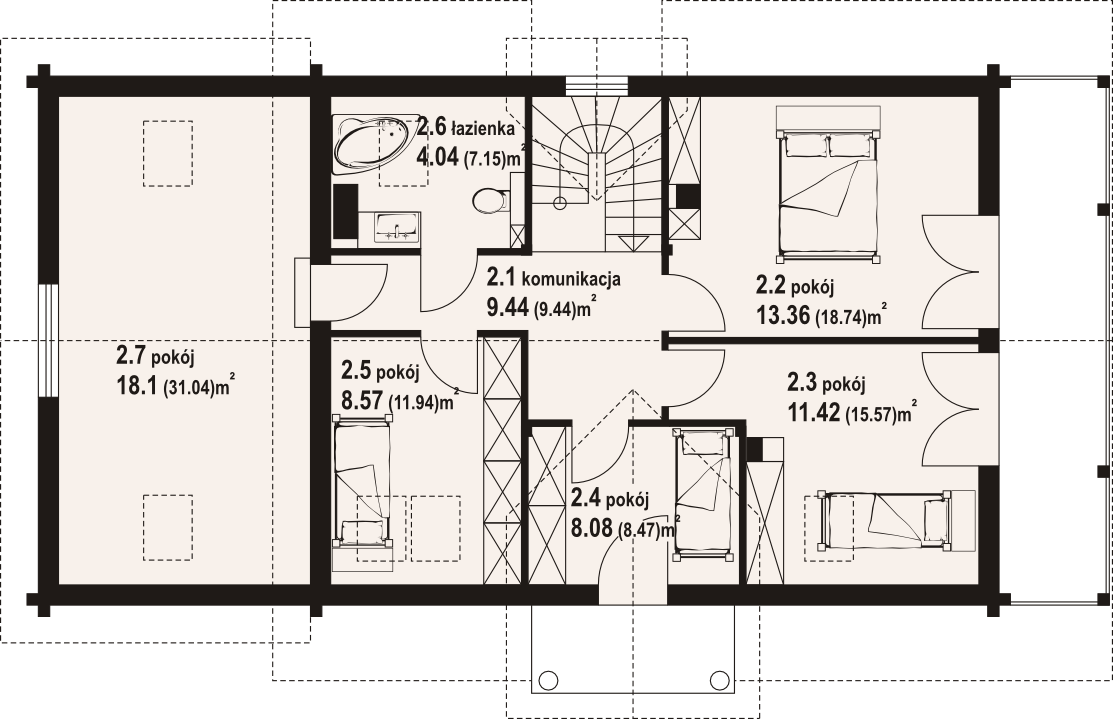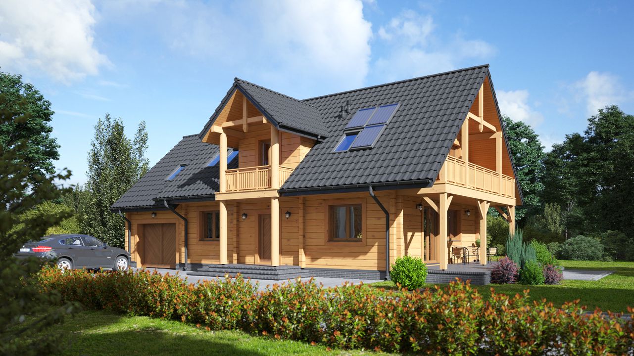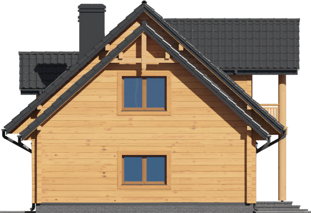 Wysokość ścianki kolankowej: 0.88 m. Strop: drewniany. Pokrycie dachu: dachówka ceramiczna. Ściany zewnętrzne: płazy drewniane + wełna mineralna + deska. Ściany wewnętrzne: płazy drewniane. Typ ogrzewania: kocioł gazowy lub kocioł na paliwo stałe. Instalacje dodatkowe: instalacja wentylacji mech. z rekuperacją, instalacja solarna. Inne: okna połaciowe Velux.