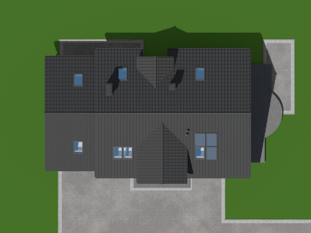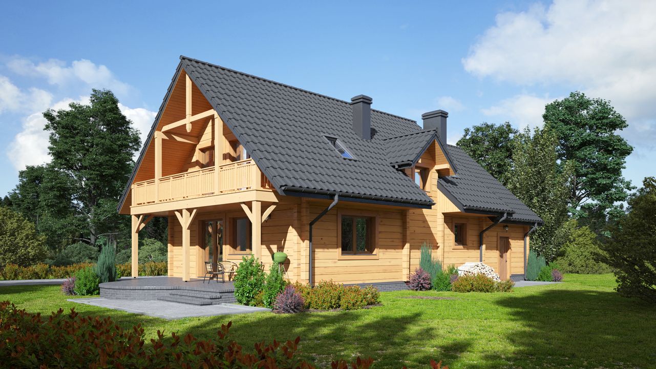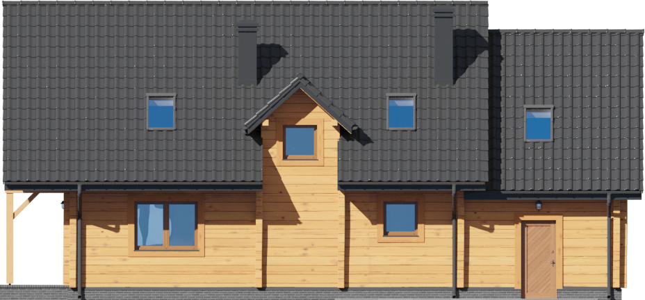 Graficzne opracowanie rzutów poglądowych widocznych na karcie projektu zostało wykonane przez Extradom.pl. Prezentowane przez Extradom.pl wizualizacje wykonane zostały przez autora projektu i należy poczytywać je jedynie za przykład i propozycję wykończenia, wizję architektoniczną autora projektu. Ostateczne wykończenie budynku może nastąpić na wiele sposobów. Szczegółowe rozwiązania zastosowane w oferowanej dokumentacji - w tym również ilość, lokalizacje i wygląd okien, drzwi, kominów - mogą w niewielkim stopniu różnić się od prezentowanej wizualizacji budynku.