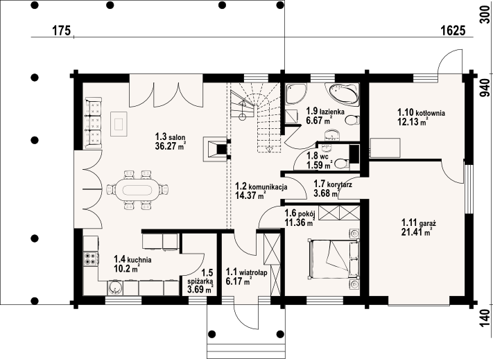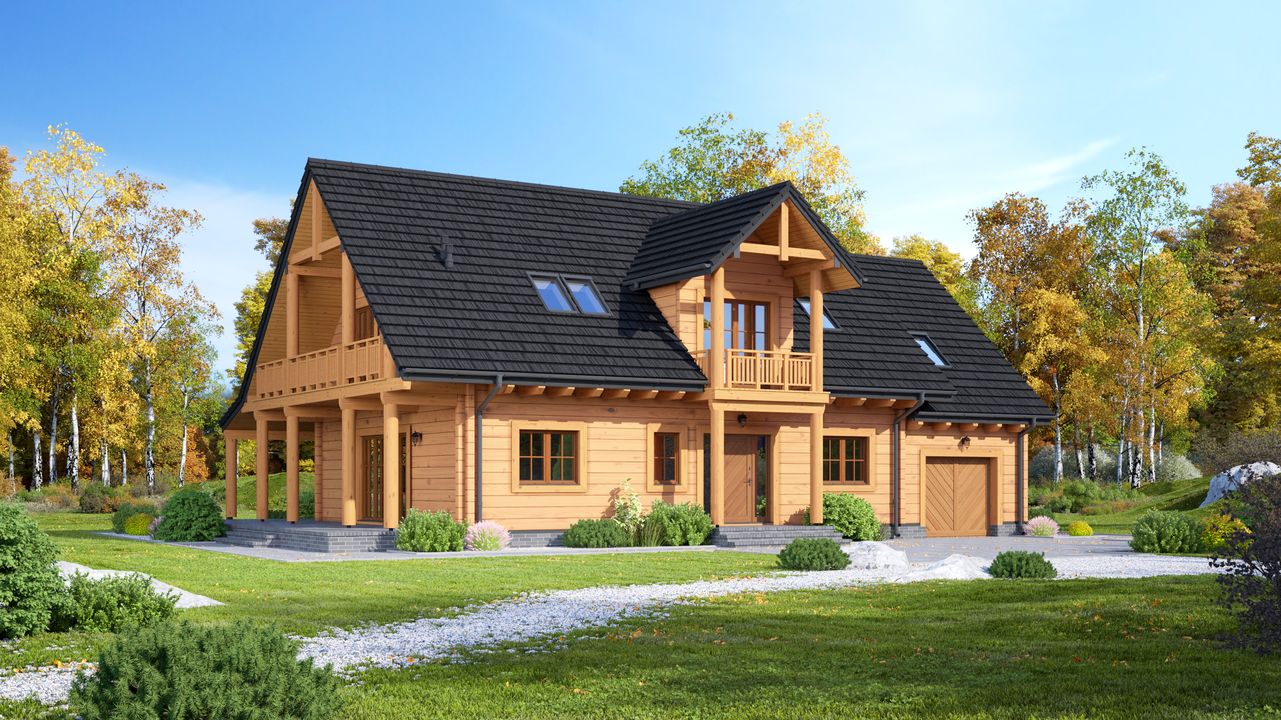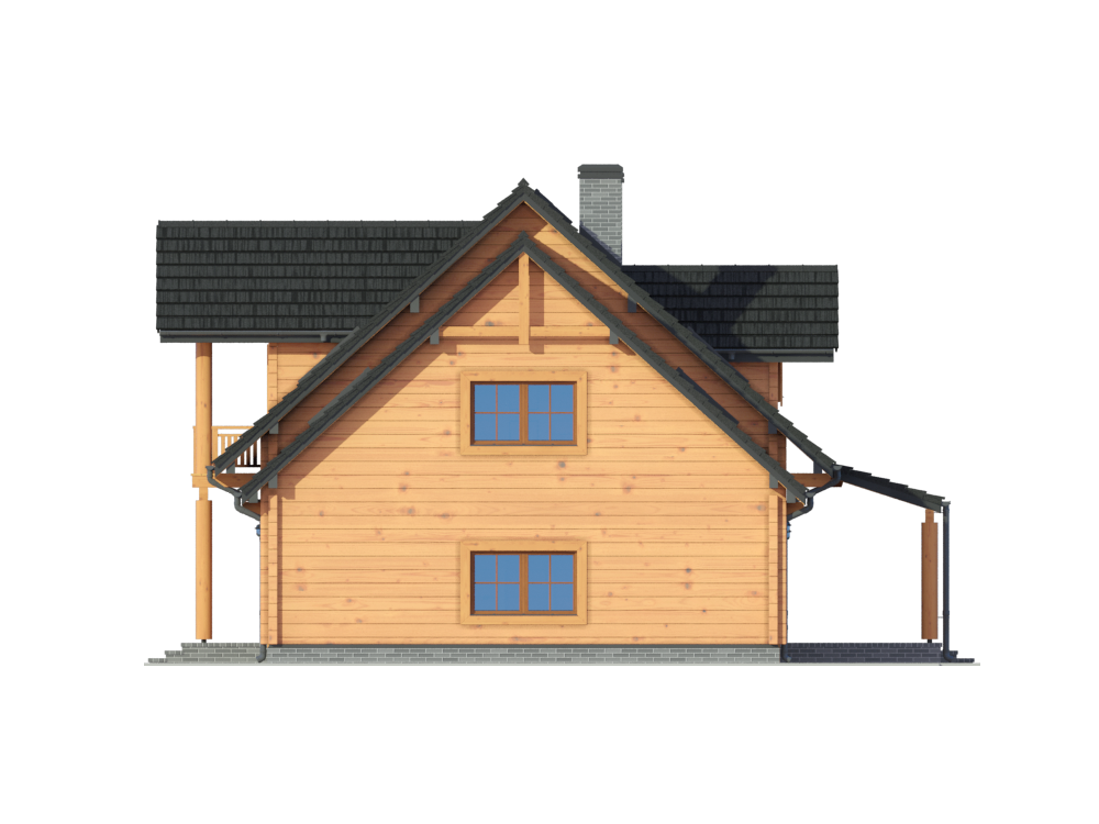 Wysokość ścianki kolankowej: 0.75 m. Strop: drewniany. Pokrycie dachu: dachówka gontopodobna Gerard Corona. Ściany zewnętrzne: płazy drewniane + wełna mineralna + deska. Ściany wewnętrzne: płazy drewniane. Typ ogrzewania: kocioł gazowy lub kocioł na paliwo stałe. Instalacje dodatkowe: instalacja wentylacji mech. z rekuperacją. Inne: brama garażowa Hörmann, okna dachowe Fakro Greenview.