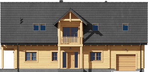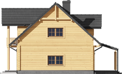 Wysokość ścianki kolankowej: 0.74 m. Strop: drewniany. Pokrycie dachu: dachówka gontopodobna Gerard Corona. Ściany zewnętrzne: płazy drewniane + wełna mineralna + deska. Ściany wewnętrzne: płazy drewniane. Typ ogrzewania: pompa ciepła. Instalacje dodatkowe: instalacja solarna. Inne: okna połaciowe Fakro.