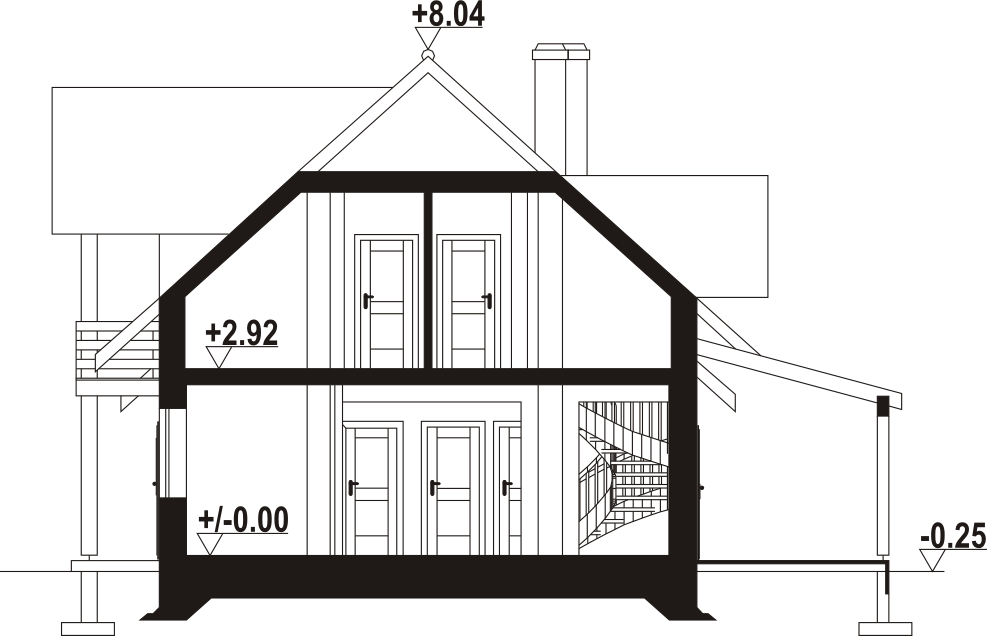 Wysokość ścianki kolankowej: 1.09 m. Strop: płyta żelbetowa. Pokrycie dachu: dachówka ceramiczna. Ściany zewnętrzne: bloczki z betonu komórkowego + wełna mineralna + deski. Ściany wewnętrzne: bloczki z betonu komórkowego. Typ ogrzewania: kocioł gazowy lub kocioł na paliwo stałe. Instalacje dodatkowe: instalacja solarna. Inne: płyta fundamentowa, okna połaciowe Fakro.