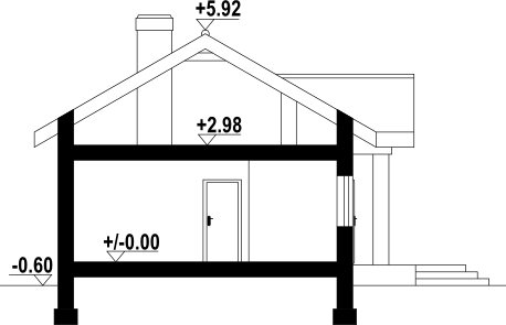 Wysokość ścianki kolankowej: 0.59 m. Strop: płyta żelbetowa. Pokrycie dachu: dachówka ceramiczna. Ściany zewnętrzne: pustaki ceramiczne + styropian. Ściany wewnętrzne: pustaki ceramiczne. Typ ogrzewania: kocioł gazowy.