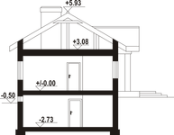 Wysokość ścianki kolankowej: 0.47 m. Strop: płyta żelbetowa. Pokrycie dachu: dachówka ceramiczna. Ściany zewnętrzne: pustaki ceramiczne + styropian. Ściany wewnętrzne: pustaki ceramiczne. Typ ogrzewania: kocioł gazowy lub kocioł na paliwo stałe.