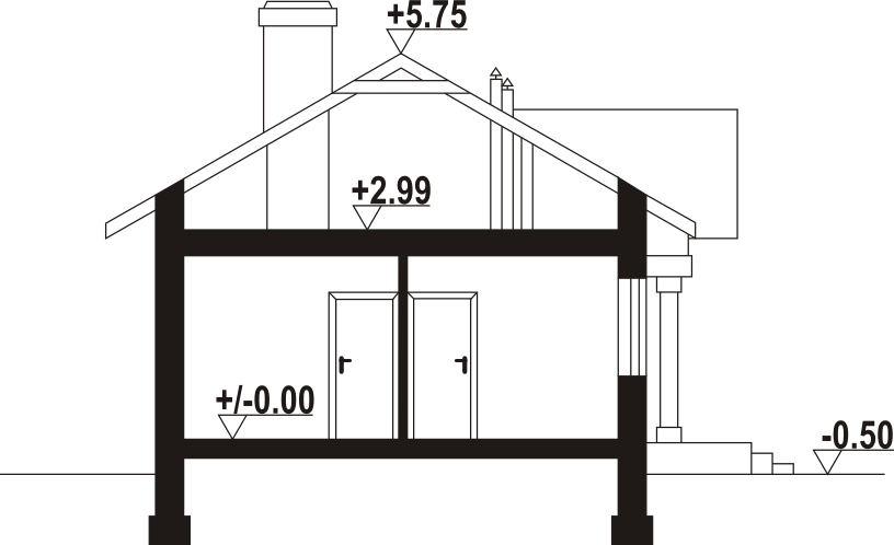 Wysokość ścianki kolankowej: 0.52 m. Ilość drewna na więźbę: 4.41 m³. Strop: płyta żelbetowa. Pokrycie dachu: dachówka ceramiczna. Ściany zewnętrzne: pustaki ceramiczne + styropian. Ściany wewnętrzne: pustaki ceramiczne. Typ ogrzewania: kocioł gazowy. Instalacje dodatkowe: instalacja solarna.