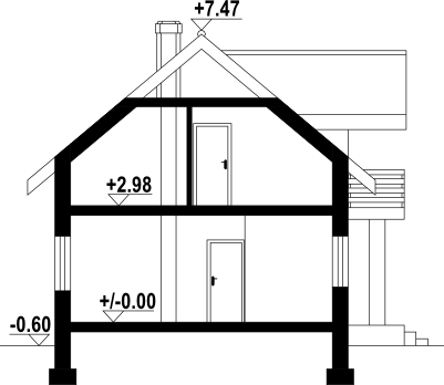 Wysokość ścianki kolankowej: 1.05 m. Strop: płyta żelbetowa. Pokrycie dachu: dachówka ceramiczna. Ściany zewnętrzne: pustaki ceramiczne + styropian. Ściany wewnętrzne: pustaki ceramiczne. Typ ogrzewania: kocioł gazowy.