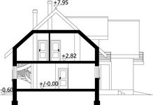 Wysokość ścianki kolankowej: 1.17 m. Strop: płyta żelbetowa. Pokrycie dachu: dachówka ceramiczna. Ściany zewnętrzne: pustaki ceramiczne + styropian. Ściany wewnętrzne: pustaki ceramiczne. Typ ogrzewania: kocioł gazowy lub kocioł na paliwo stałe.