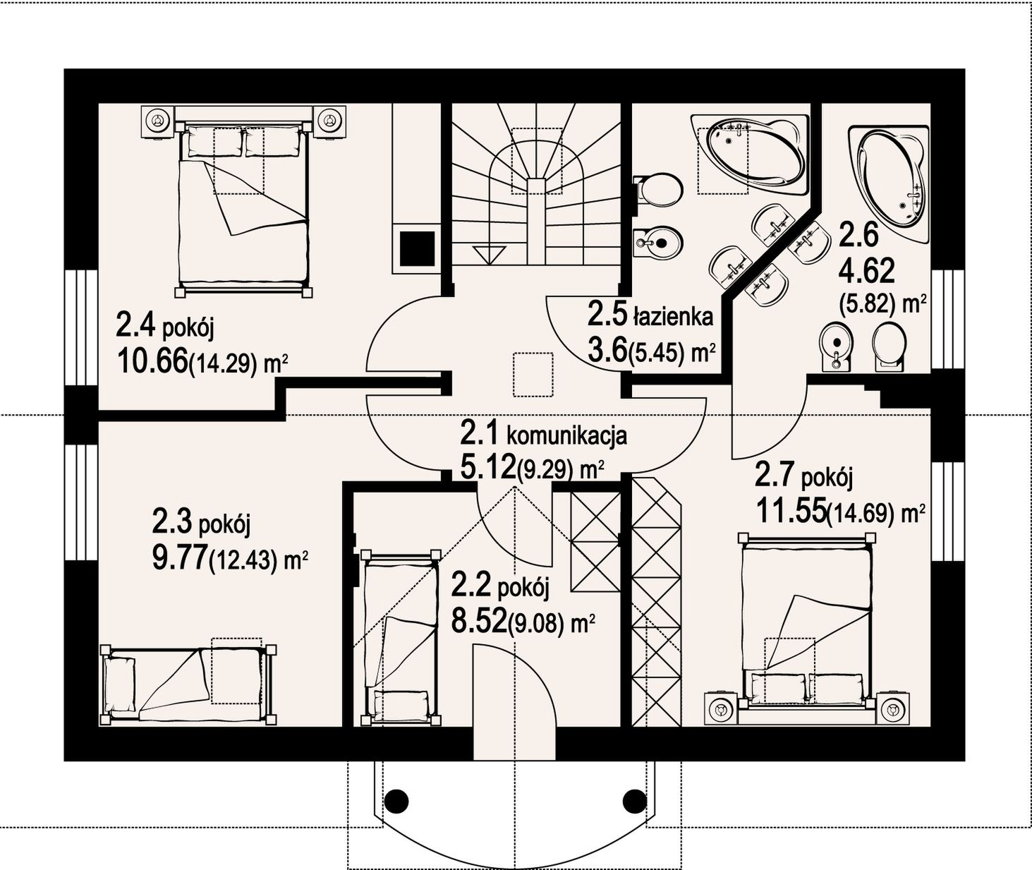 Wysokość ścianki kolankowej: 1.14 m. Ilość drewna na więźbę: 7.2 m³. Strop: płyta żelbetowa. Pokrycie dachu: dachówka ceramiczna. Ściany zewnętrzne: pustaki ceramiczne + styropian. Ściany wewnętrzne: pustaki ceramiczne. Typ ogrzewania: kocioł gazowy lub kocioł na paliwo stałe. Inne: okna połaciowe Fakro.