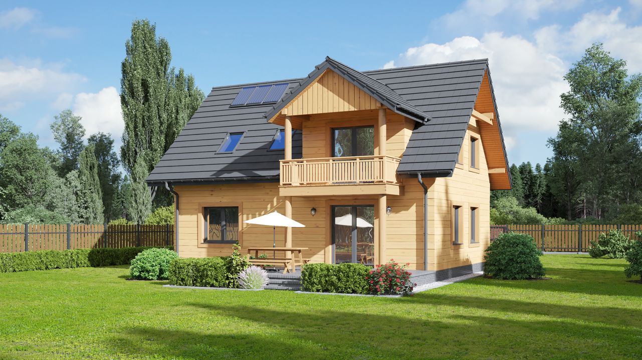 Wysokość ścianki kolankowej: 1 m. Strop: drewniany. Pokrycie dachu: dachówka gontopodobna Gerard Corona. Ściany zewnętrzne: szkieletowe drewniane ocieplone wełną mineralną. Ściany wewnętrzne: szkieletowe drewniane. Typ ogrzewania: kocioł gazowy lub kocioł na paliwo stałe. Instalacje dodatkowe: instalacja solarna. Inne: okna połaciowe Velux.