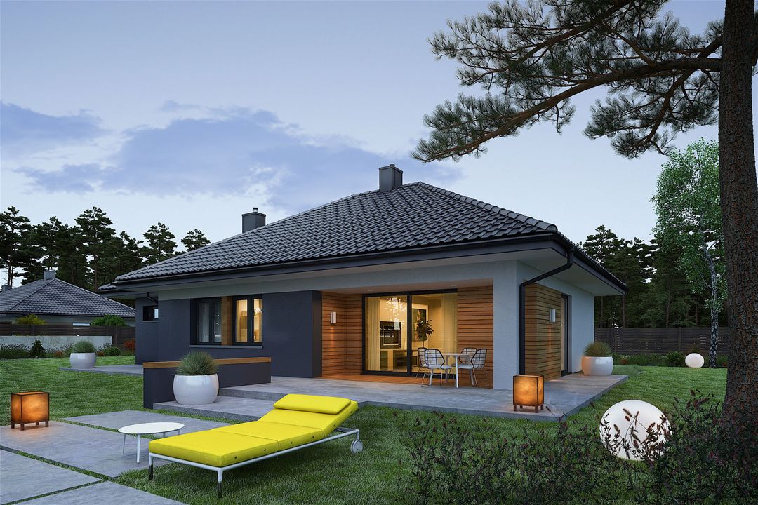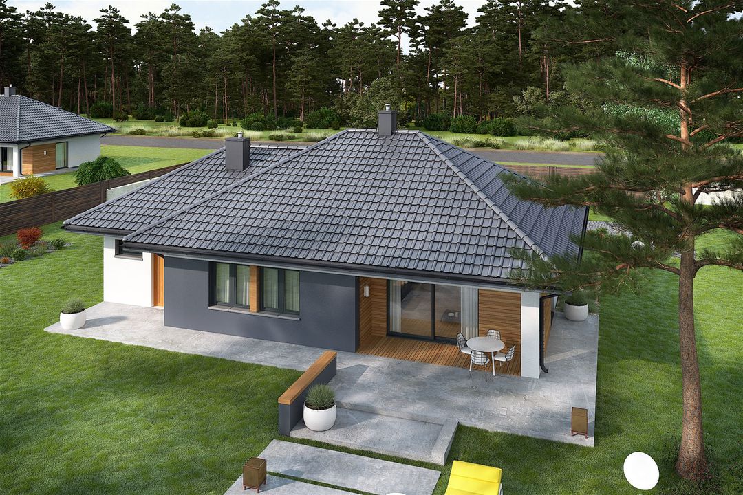 Graficzne opracowanie rzutów poglądowych widocznych na karcie projektu zostało wykonane przez Extradom.pl. Prezentowane przez Extradom.pl wizualizacje wykonane zostały przez autora projektu i należy poczytywać je jedynie za przykład i propozycję wykończenia, wizję architektoniczną autora projektu. Ostateczne wykończenie budynku może nastąpić na wiele sposobów. Szczegółowe rozwiązania zastosowane w oferowanej dokumentacji - w tym również ilość, lokalizacje i wygląd okien, drzwi, kominów - mogą w niewielkim stopniu różnić się od prezentowanej wizualizacji budynku.