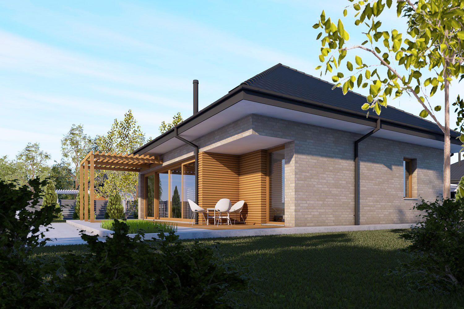 Ściany zewnętrzne: murowane, dwuwarstwowe, beton komórkowy firmy H+H 24 cm, ocieplenie styropian Termo Organika 20 cm. Ściany wewnętrzne: nośne i działowe murowane, beton komórkowy firmy H+H 24 cm i 12 cm. Strop: strop gęstożebrowy Teriva, ocieplenie wełna mineralna firmy Isover 30 cm. Dach: konstrukcja drewniana, ocieplenie wełna mineralna Isover 30 cm, dachówka ceramiczna płaska Bergamo firmy Röben. Rozwiązania instalacyjne energooszczędne. Ogrzewanie: pompa ciepła np. firmy Vaillant, rozprowadzenie ciepła: ogrzewanie podłogowe firmy Purmo. Wentylacja: wentylacja mechaniczna nawiewno-wywiewna np. firmy Vaillant. OZE: system fotowoltaiczny. Dodatkowo: stacja uzdatniania wody firmy Viessmann. Elewacje: płytki klinkierowe CALAIS firmy Röben, tynk cienkowarstwowy mineralny w kolorze białym TO-PA 001 z palety firmy Termo Organika, okładzina drewniana. Stolarka: drewniana, PVC lub aluminiowa, drzwi tarasowe podnoszono-przesuwne typu HS aluminiowo-drewniane Innowiev firmy Fakro, drzwi wewnętrzne i wejściowe firmy Hörmann. Okna połaciowe: rozwiązania technologiczne firmy Velux. Otoczenie: kostka betonowa i płyty tarasowe firmy Libet, system tarasowy ProDeck - deska kompozytowa Terra w kolorze orzech.