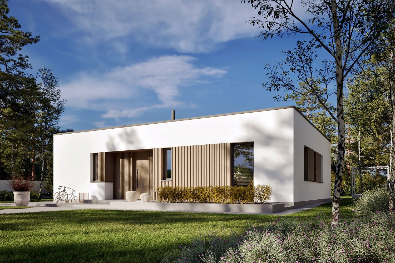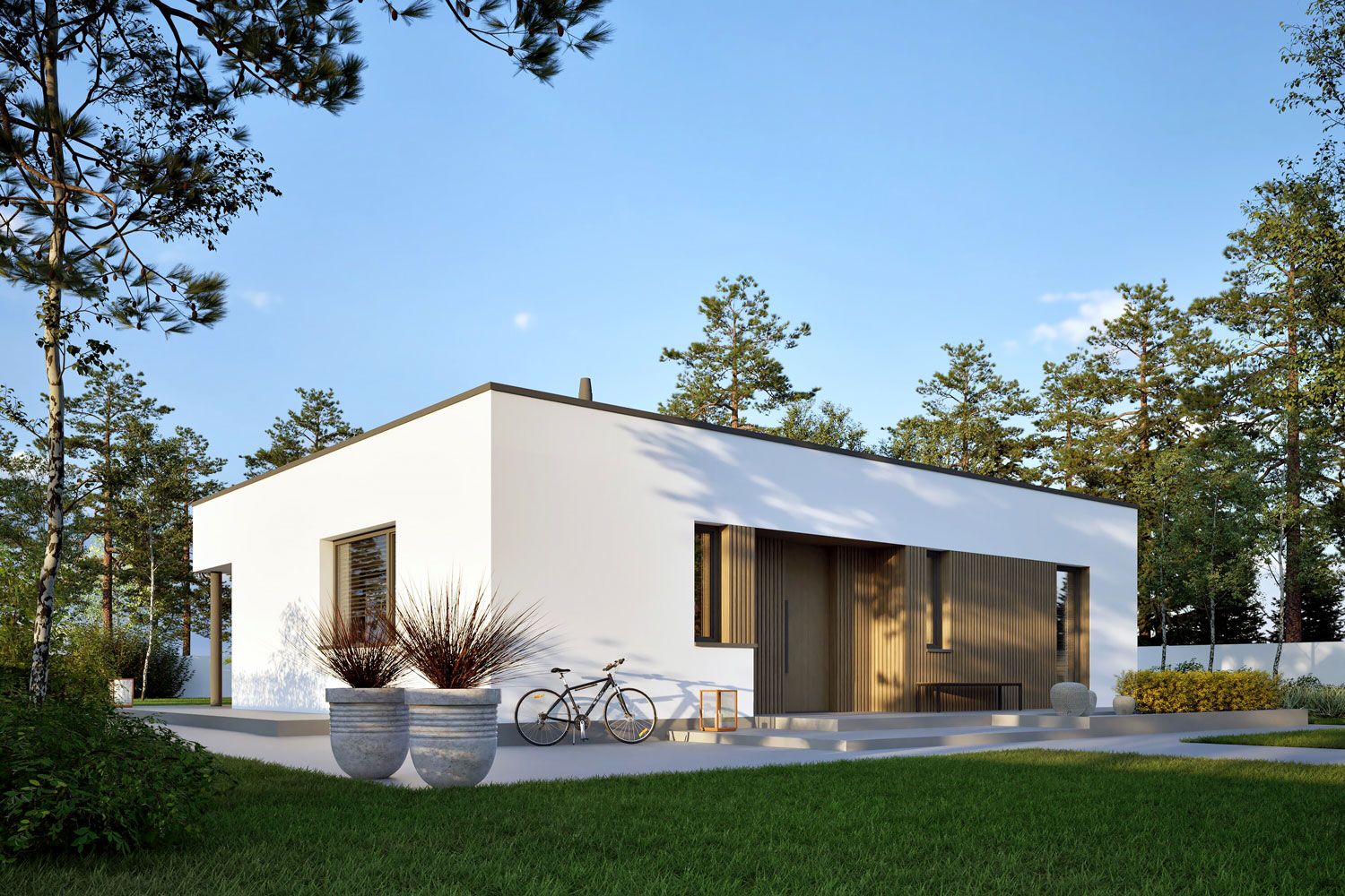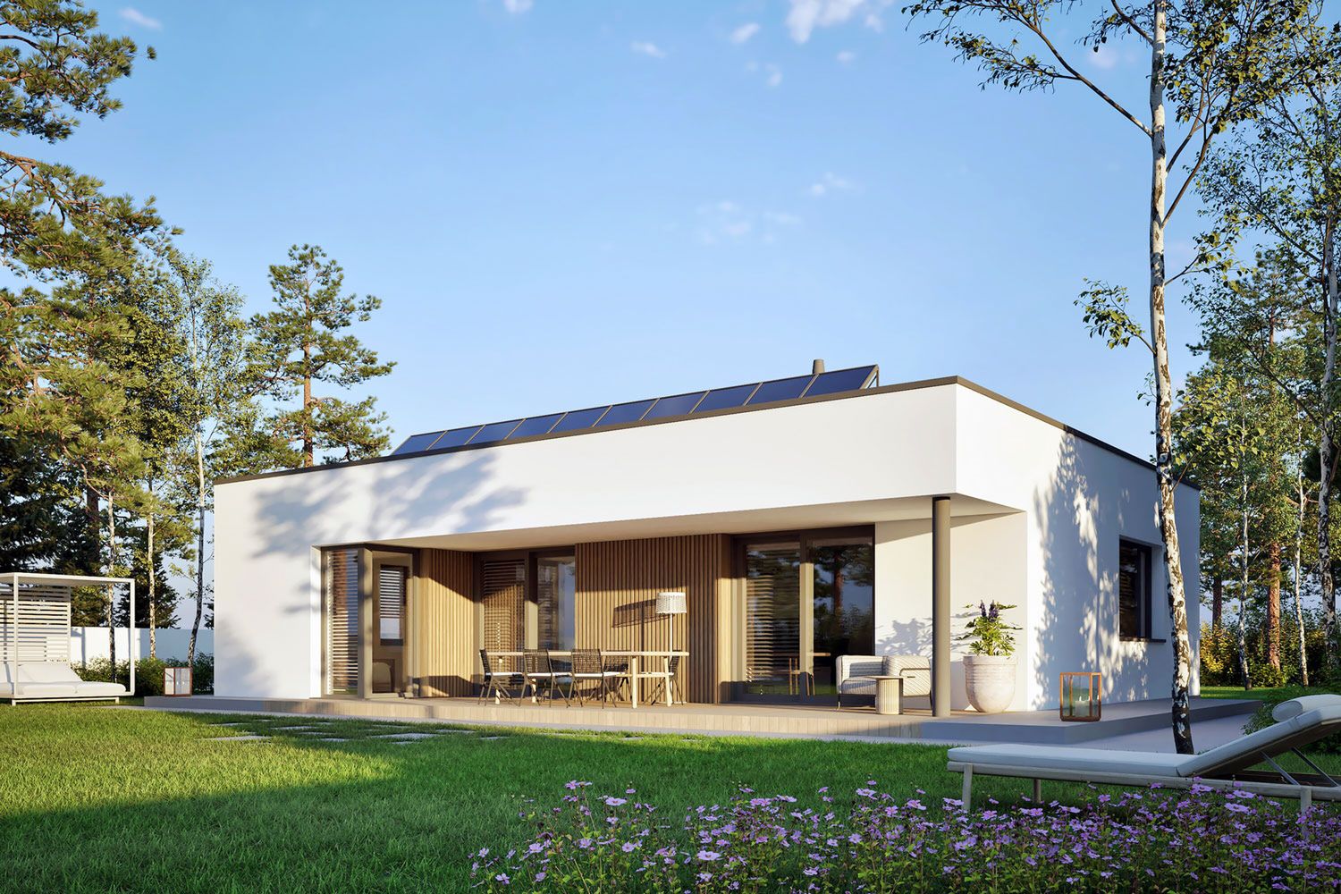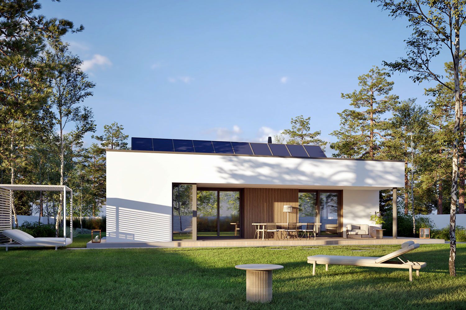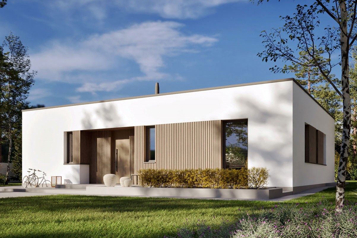 Ściany zewnętrzne: murowane, dwuwarstwowe, beton komórkowy, ocieplenie styropian Termo Organika 20 cm. Ściany wewnętrzne: nośne i działowe murowane, beton komórkowy 24 cm i 12 cm. Strop: strop gęstożebrowy Teriva, ocieplenie styropian 30 cm. Dach: stropodach płaski. Rozwiązania instalacyjne energooszczędne. Ogrzewanie: pompa ciepła firmy Viessmann, rozprowadzenie ciepła: ogrzewanie podłogowe firmy Purmo. Wentylacja: wentylacja mechaniczna nawiewno-wywiewna z odzyskiem ciepła firmy Viessmann. OZE: panele fotowoltaiczne firmy Viessmann. Dodatkowo: stacja uzdatniania wody firmy Viessmann. Elewacje: tynk cienkowarstwowy mineralny w kolorze białym TO-PA 001 z palety firmy Termo Organika, okładzina drewniana. Stolarka: drewniana, PVC lub aluminiowa, drzwi tarasowe podnoszono-przesuwne typu HS aluminiowo-drewniane Innowiev firmy Fakro, drzwi wejściowe i wewnętrzne firmy Hörmann. Otoczenie: kostka betonowa i płyty tarasowe firmy Libet, system tarasowy ProDeck - deska kompozytowa Terra w kolorze orzech.