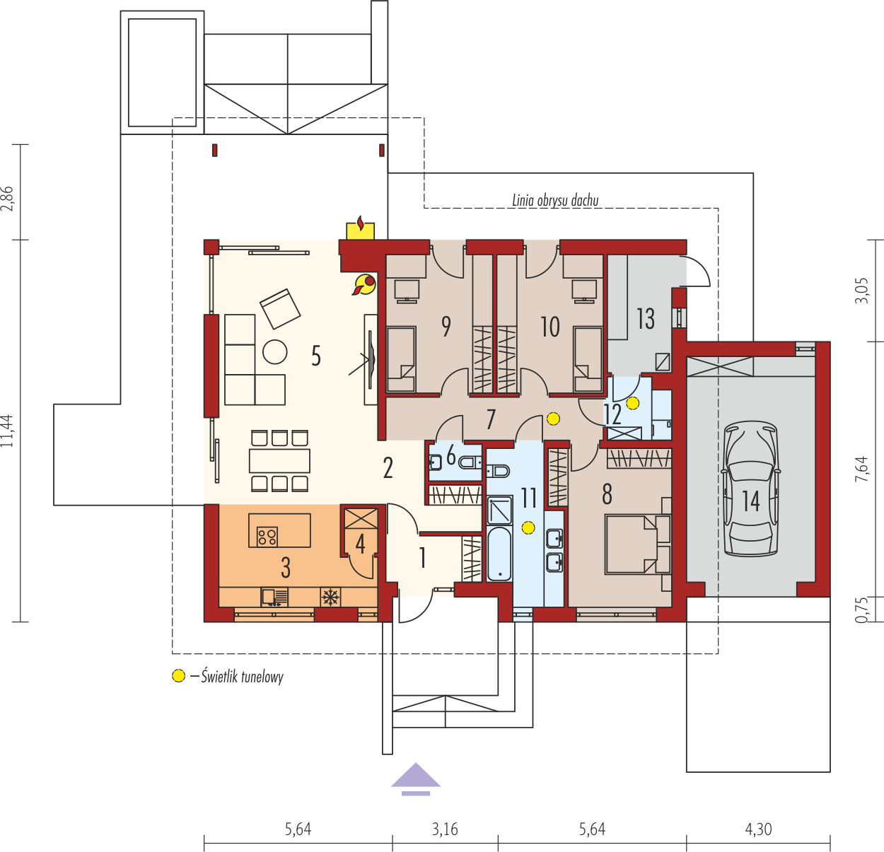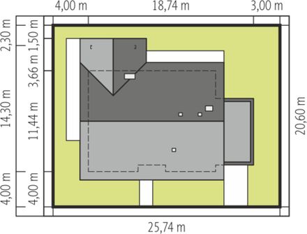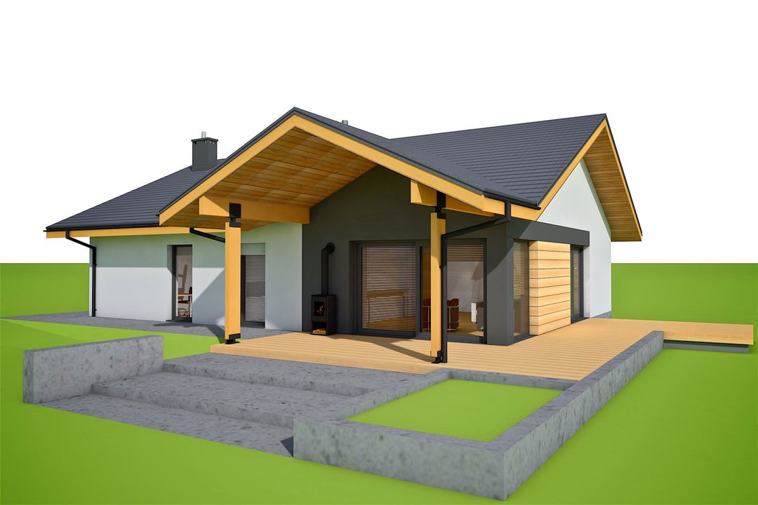 Graficzne opracowanie rzutów poglądowych widocznych na karcie projektu zostało wykonane przez Extradom.pl. Prezentowane przez Extradom.pl wizualizacje wykonane zostały przez autora projektu i należy poczytywać je jedynie za przykład i propozycję wykończenia, wizję architektoniczną autora projektu. Ostateczne wykończenie budynku może nastąpić na wiele sposobów. Szczegółowe rozwiązania zastosowane w oferowanej dokumentacji - w tym również ilość, lokalizacje i wygląd okien, drzwi, kominów - mogą w niewielkim stopniu różnić się od prezentowanej wizualizacji budynku.