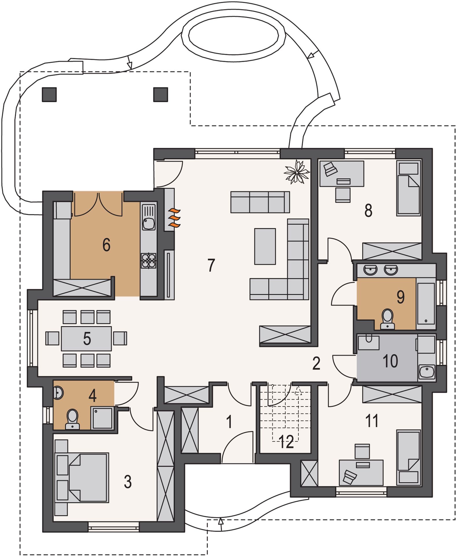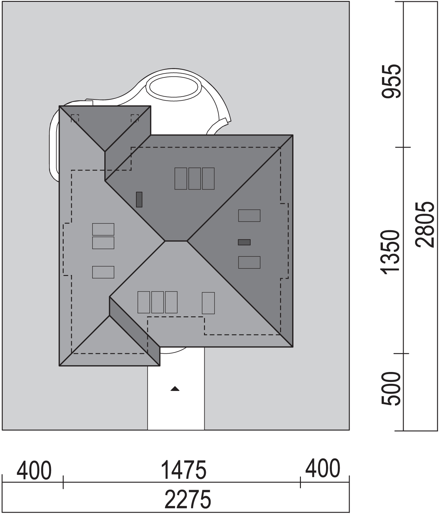 Graficzne opracowanie rzutów poglądowych widocznych na karcie projektu zostało wykonane przez Extradom.pl. Prezentowane przez Extradom.pl wizualizacje wykonane zostały przez autora projektu i należy poczytywać je jedynie za przykład i propozycję wykończenia, wizję architektoniczną autora projektu. Ostateczne wykończenie budynku może nastąpić na wiele sposobów. Szczegółowe rozwiązania zastosowane w oferowanej dokumentacji - w tym również ilość, lokalizacje i wygląd okien, drzwi, kominów - mogą w niewielkim stopniu różnić się od prezentowanej wizualizacji budynku.