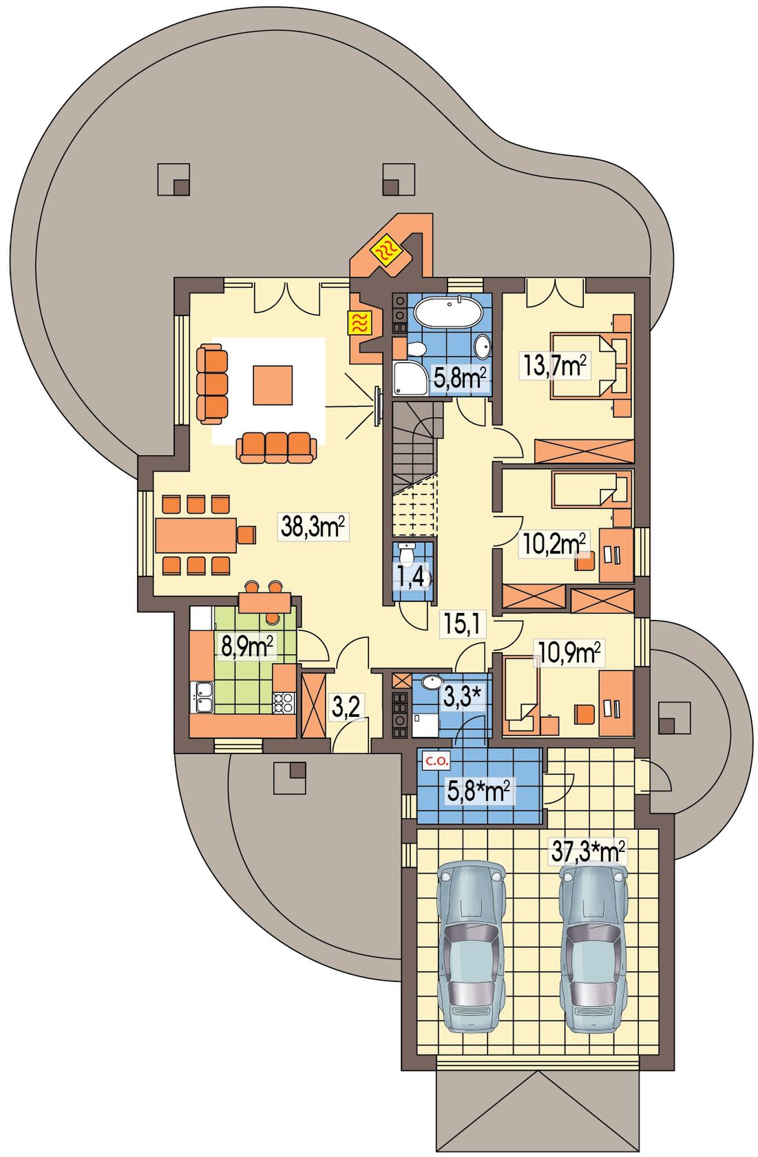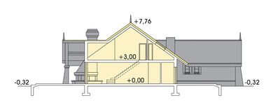 Graficzne opracowanie rzutów poglądowych widocznych na karcie projektu zostało wykonane przez Extradom.pl. Prezentowane przez Extradom.pl wizualizacje wykonane zostały przez autora projektu i należy poczytywać je jedynie za przykład i propozycję wykończenia, wizję architektoniczną autora projektu. Ostateczne wykończenie budynku może nastąpić na wiele sposobów. Szczegółowe rozwiązania zastosowane w oferowanej dokumentacji - w tym również ilość, lokalizacje i wygląd okien, drzwi, kominów - mogą w niewielkim stopniu różnić się od prezentowanej wizualizacji budynku.