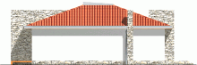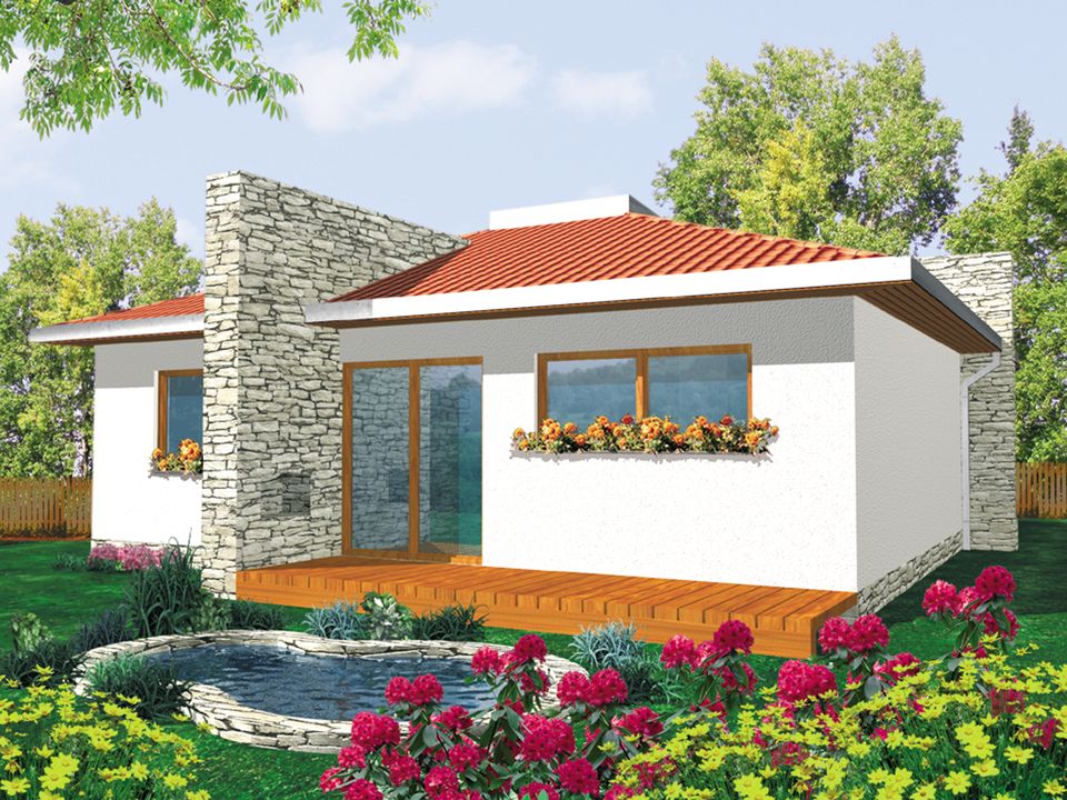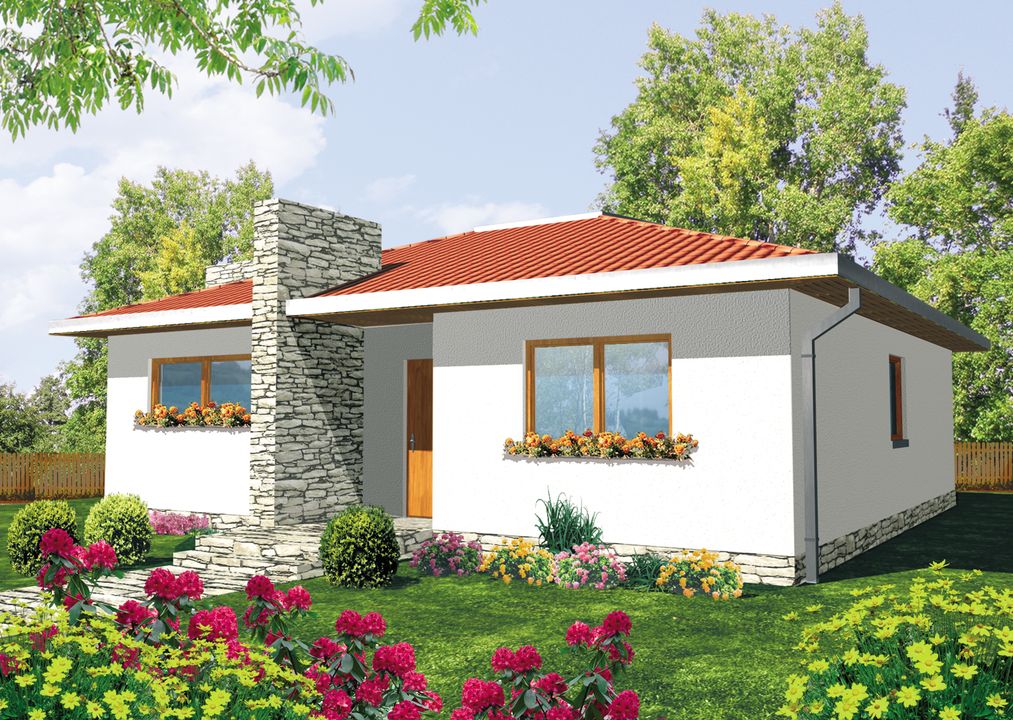 Dom zaprojektowany w technologii murowanej z odkrytą więźbą drewnianą pokrytą dachówką cementową Braas. Wykończenie Południowy charakter domu tworzą wystające ściany kominowe obłożone okładziną kamienną oraz niski dach w tradycyjnym pomarańczowym kolorze. Stolarka okenna drewniana.