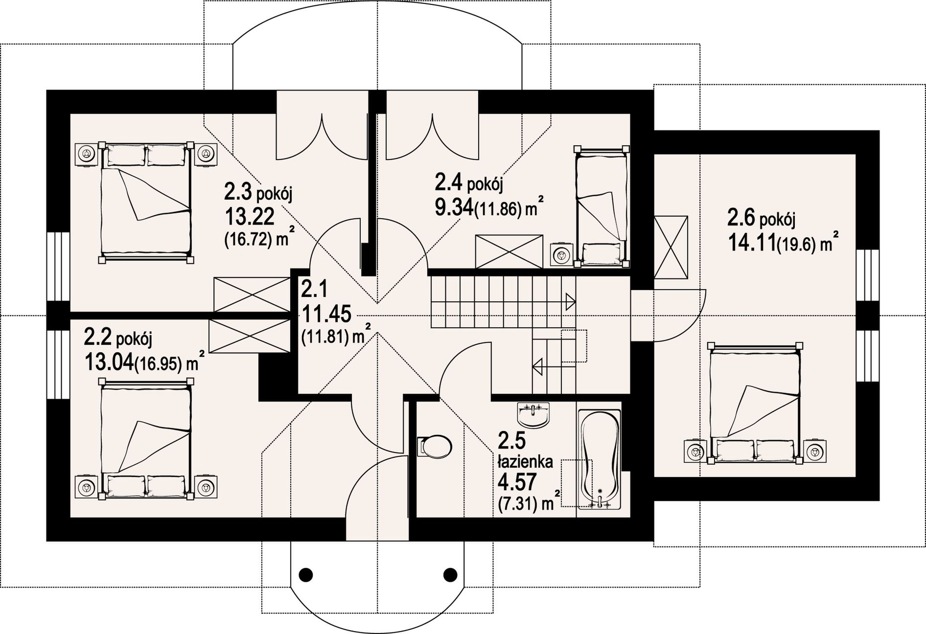 Graficzne opracowanie rzutów poglądowych widocznych na karcie projektu zostało wykonane przez Extradom.pl. Prezentowane przez Extradom.pl wizualizacje wykonane zostały przez autora projektu i należy poczytywać je jedynie za przykład i propozycję wykończenia, wizję architektoniczną autora projektu. Ostateczne wykończenie budynku może nastąpić na wiele sposobów. Szczegółowe rozwiązania zastosowane w oferowanej dokumentacji - w tym również ilość, lokalizacje i wygląd okien, drzwi, kominów - mogą w niewielkim stopniu różnić się od prezentowanej wizualizacji budynku.
