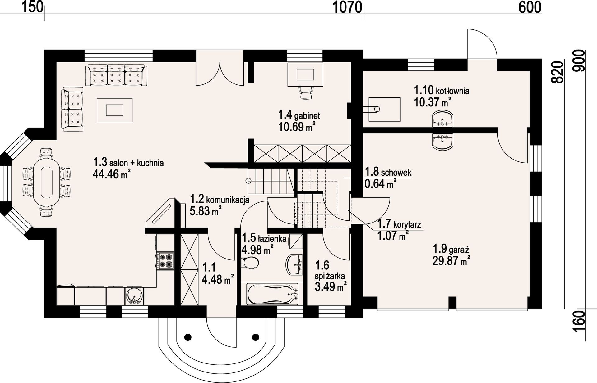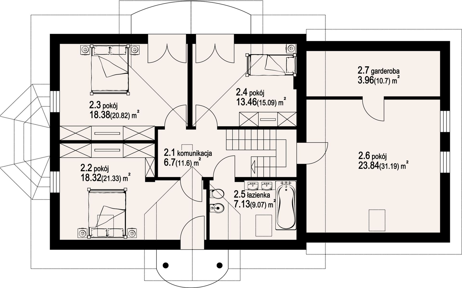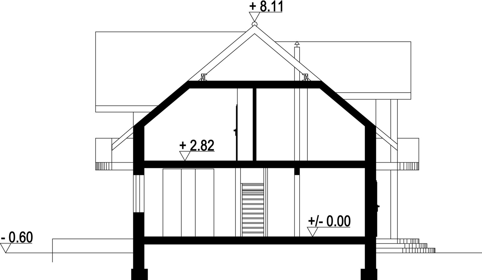 Wysokość ścianki kolankowej: 1.29 m. Strop: płyta żelbetowa. Pokrycie dachu: dachówka ceramiczna. Ściany zewnętrzne: pustaki ceramiczne + styropian. Ściany wewnętrzne: pustaki ceramiczne. Typ ogrzewania: kocioł gazowy lub kocioł na paliwo stałe. Inne: okna połaciowe Velux.