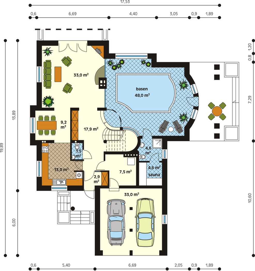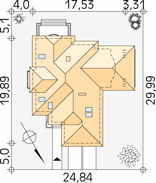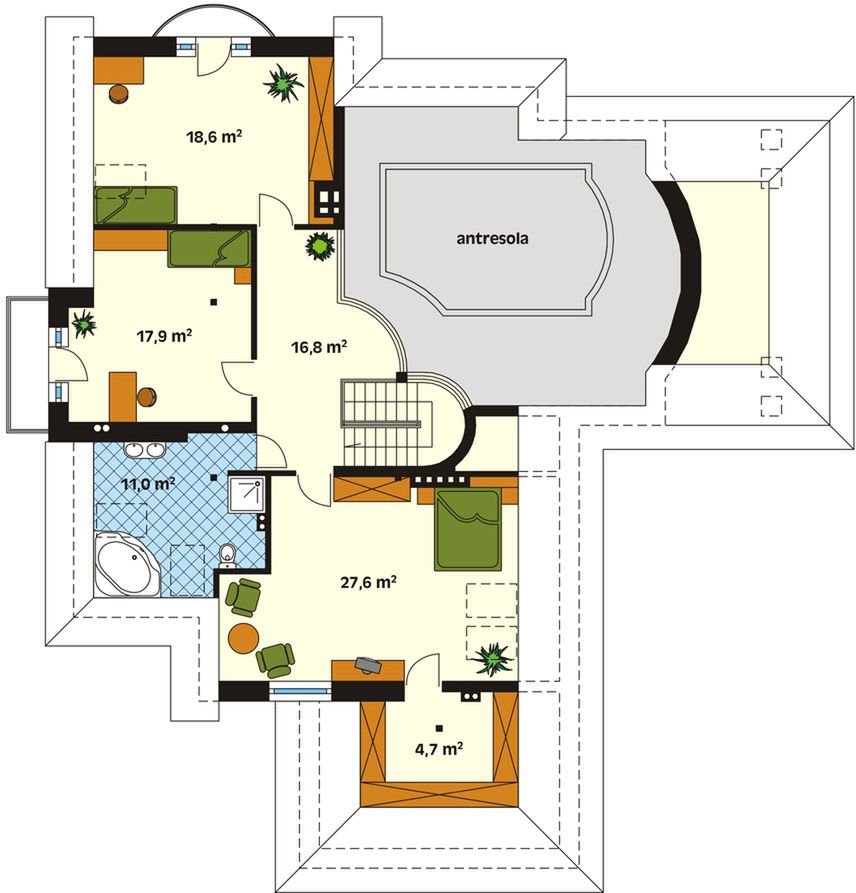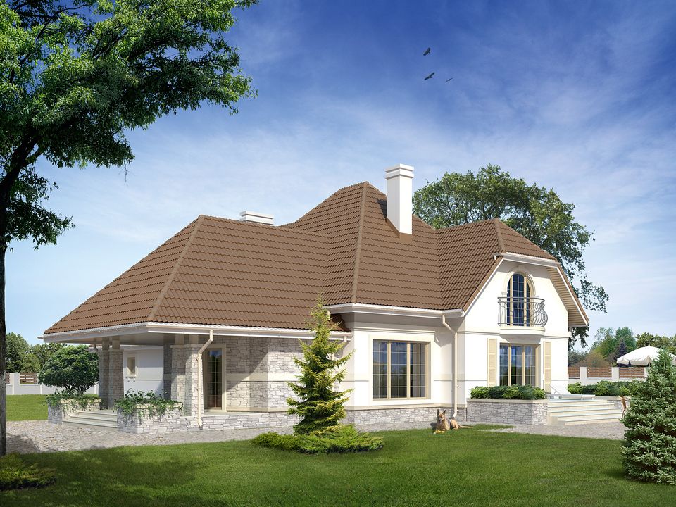 Graficzne opracowanie rzutów poglądowych widocznych na karcie projektu zostało wykonane przez Extradom.pl. Prezentowane przez Extradom.pl wizualizacje wykonane zostały przez autora projektu i należy poczytywać je jedynie za przykład i propozycję wykończenia, wizję architektoniczną autora projektu. Ostateczne wykończenie budynku może nastąpić na wiele sposobów. Szczegółowe rozwiązania zastosowane w oferowanej dokumentacji - w tym również ilość, lokalizacje i wygląd okien, drzwi, kominów - mogą w niewielkim stopniu różnić się od prezentowanej wizualizacji budynku.