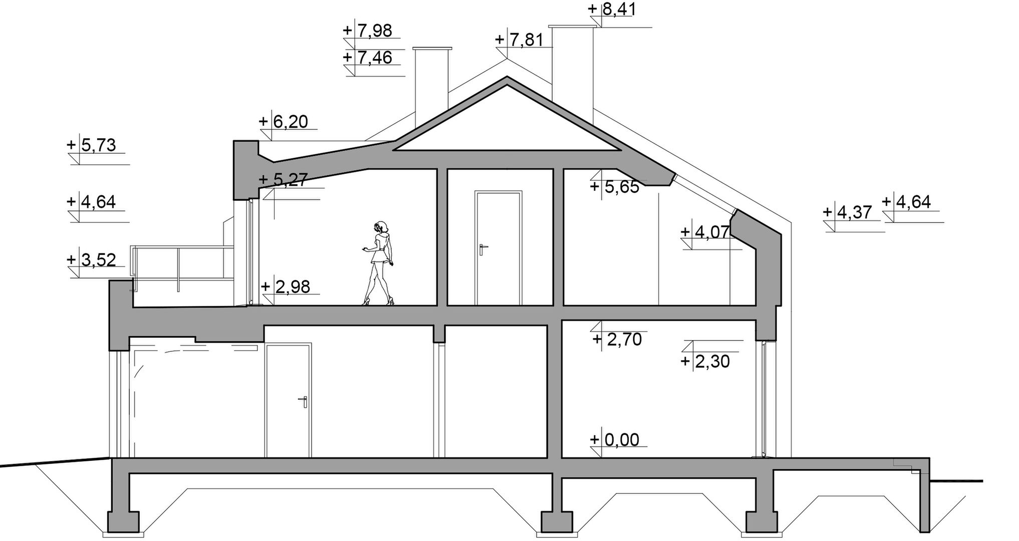 Fundamenty: Budynek posadowiony na ławach i stopach fundamentowych. Ściany zewnętrzne: Murowane, dwuwarstwowe ściany z bloczków Silka o grubości 24cm na zaprawie cienkowarstwowej, ocieplone styropianem o grubości 15cm. W miejscach występowania paneli ściany trójwarstwowe z bloczków Silka, 15 cm styropianu oraz paneli tytanowo cynkowych. Ściany wewnętrzne: Ściany murowane z bloczków Silka o grubości 24cm, w miejscach wyznaczonych w projekcie słupy i elementy żelbetowe. Ściany działowe z bloczków Silka o grubości 12cm. Stropy: Stropy między kondygnacyjne projektuje się jako żelbetowe. Posadzki w garażu: szlichta cementowa zbrojona siatkami zgrzewanymi grub. 7 cm ze spadkiem w kierunku spustów. Posadzka dylatowana, zbrojona mikrozbrojeniem, utwardzona powierzchniowo. Konstrukcja dachu: Dach dwuspadkowy, krokwie 8x20cm, ocieplone wełną mineralną. Pokrycie dachu: Blacha tytanowo cynkowa na rąbek stojący. Wykończenie elewacji: Tynk, w wyznaczonych miejscach okładzina z paneli.