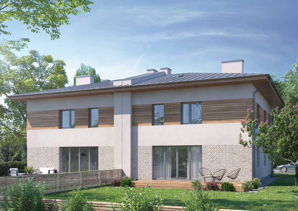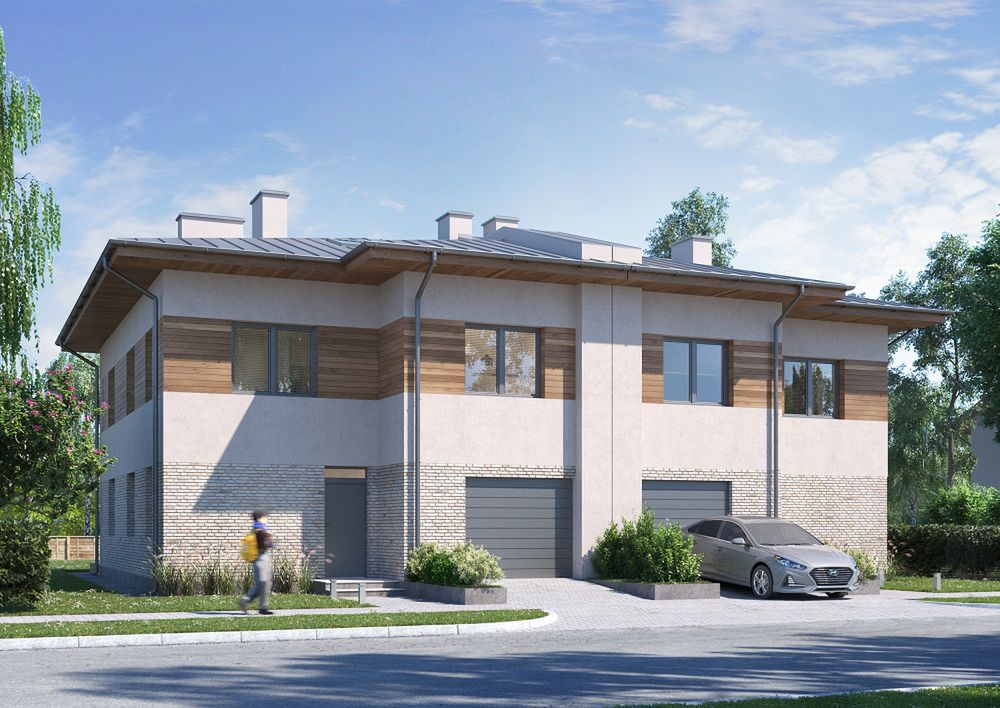 MJS-104 Bliźniak charakteryzuje się klasyczną, zwartą bryłą przykrytą eleganckim dachem kopertowym, co nadaje mu ponadczasowy, tradycyjny wygląd. Wysunięty do przodu garaż stanowi integralną część projektu, podkreślając jego solidny charakter. Prosta forma budynku, pozbawiona skomplikowanych detali architektonicznych, przekłada się na sprawną i ekonomiczną realizację inwestycji.