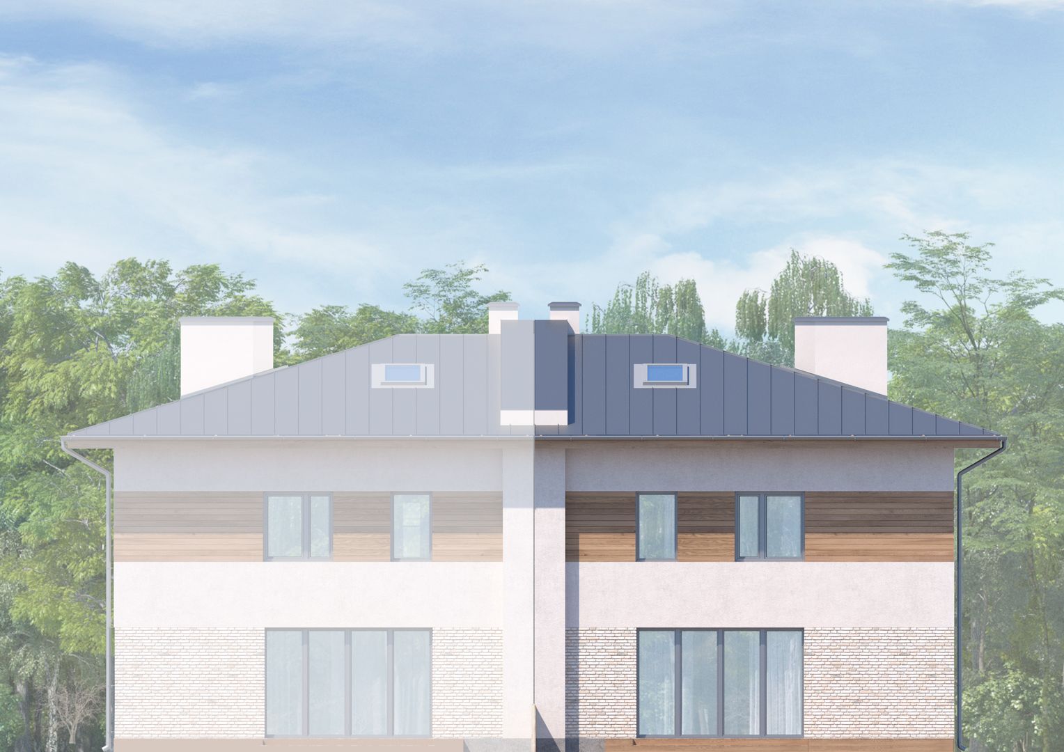 Graficzne opracowanie rzutów poglądowych widocznych na karcie projektu zostało wykonane przez Extradom.pl. Prezentowane przez Extradom.pl wizualizacje wykonane zostały przez autora projektu i należy poczytywać je jedynie za przykład i propozycję wykończenia, wizję architektoniczną autora projektu. Ostateczne wykończenie budynku może nastąpić na wiele sposobów. Szczegółowe rozwiązania zastosowane w oferowanej dokumentacji - w tym również ilość, lokalizacje i wygląd okien, drzwi, kominów - mogą w niewielkim stopniu różnić się od prezentowanej wizualizacji budynku.
