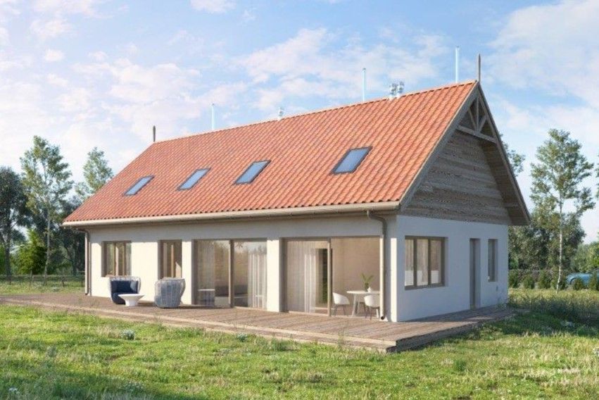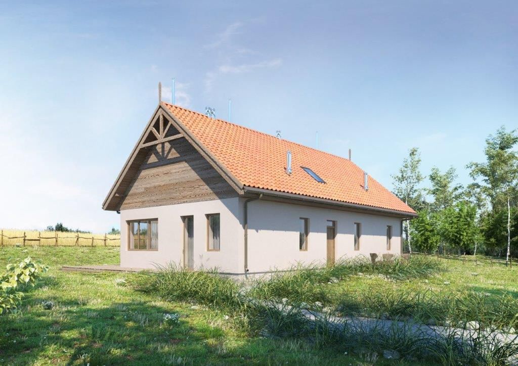 Projekt charakteryzuje się prostą, zwartą bryłą przykrytą dwuspadowym dachem z klasycznym okapem. Taka konstrukcja jest nie tylko ponadczasowa i estetyczna, ale również sprawdzona i ekonomiczna w realizacji. Tradycyjny styl domu podkreśla jego przytulny charakter, a przemyślane rozmieszczenie okien zapewnia dobre doświetlenie wnętrz. Z salonu przewidziano wyjście na taras, który w naturalny sposób łączy dom z ogrodem i staje się idealnym miejscem do letniego wypoczynku.