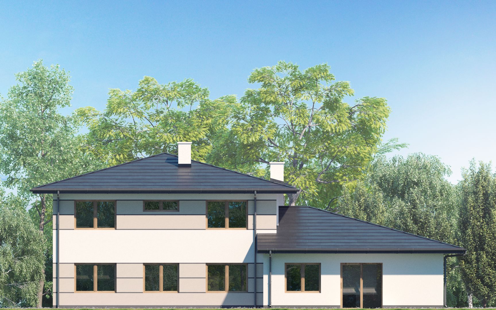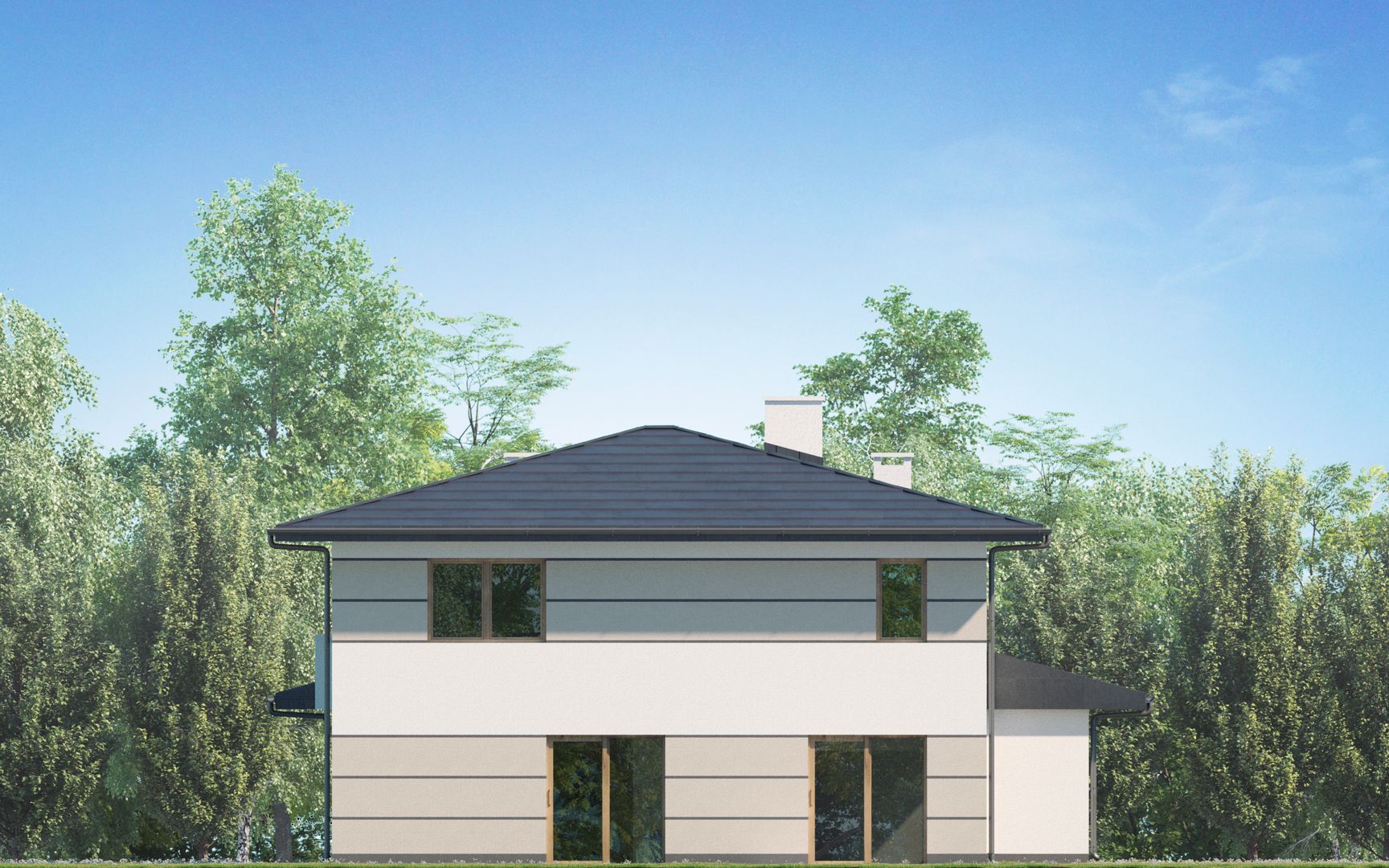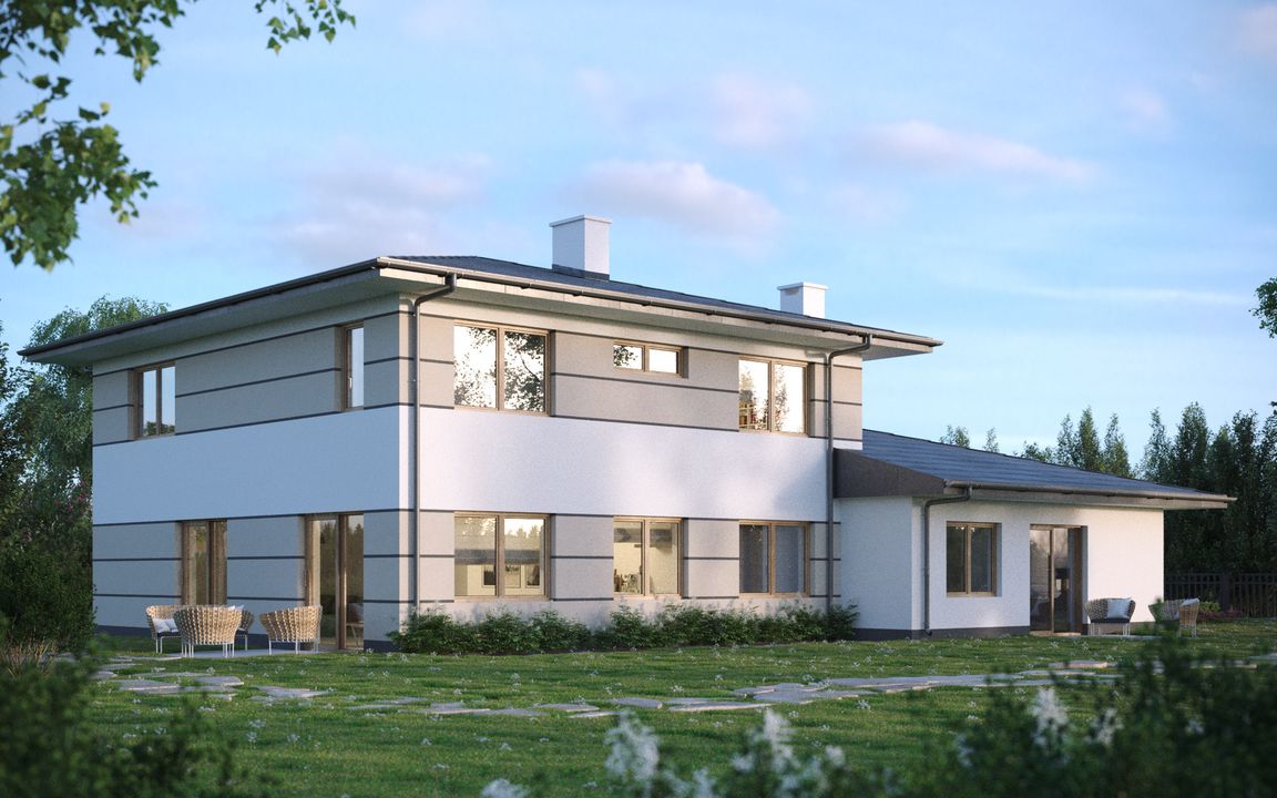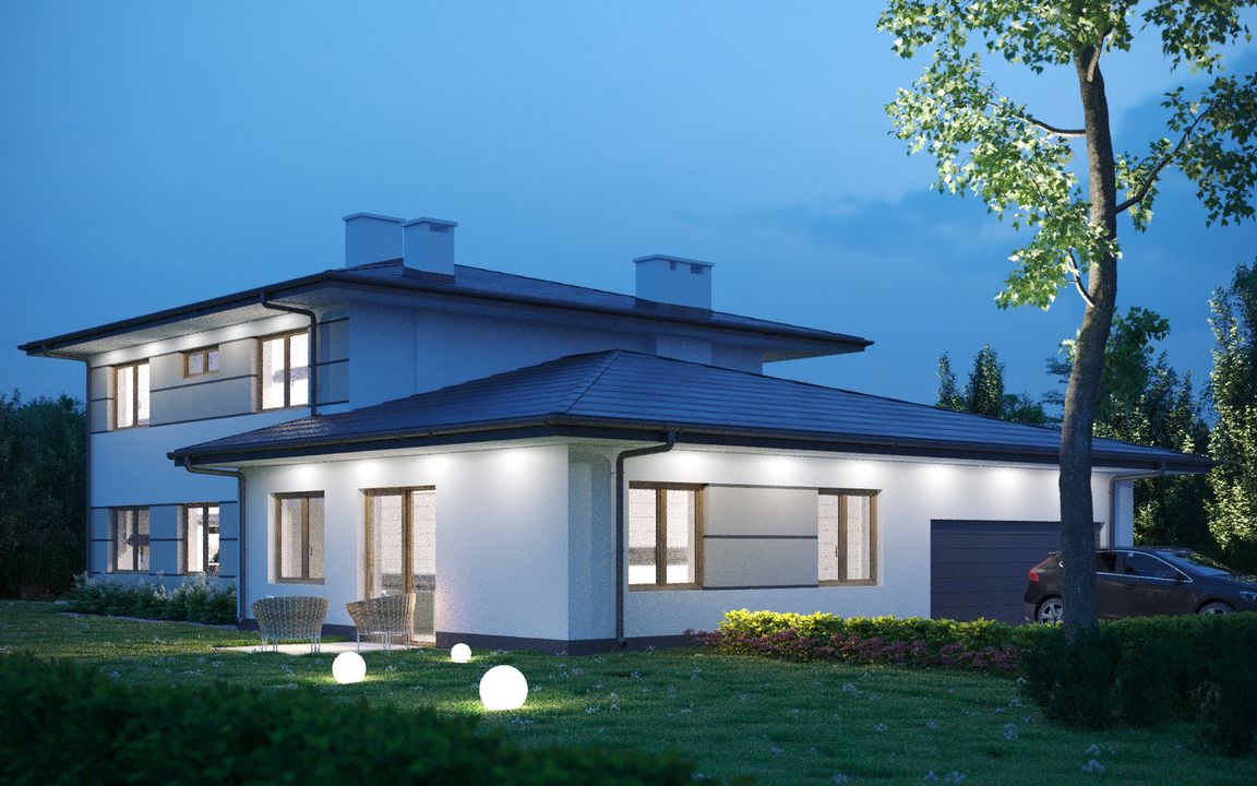 Graficzne opracowanie rzutów poglądowych widocznych na karcie projektu zostało wykonane przez Extradom.pl. Prezentowane przez Extradom.pl wizualizacje wykonane zostały przez autora projektu i należy poczytywać je jedynie za przykład i propozycję wykończenia, wizję architektoniczną autora projektu. Ostateczne wykończenie budynku może nastąpić na wiele sposobów. Szczegółowe rozwiązania zastosowane w oferowanej dokumentacji - w tym również ilość, lokalizacje i wygląd okien, drzwi, kominów - mogą w niewielkim stopniu różnić się od prezentowanej wizualizacji budynku.