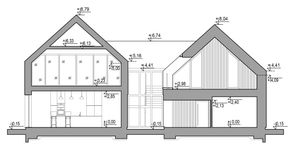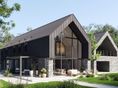 Ściany: IZODOM Super King Blok Plus 50cm/ (żelbet 20/25cm + ocieplenie 20cm); Fundament: płyta; Dach dwuspadowy, więźba drewniana, kryty blachą na rąbek stojący; Elewacja ciemna blacha na rąbek/ kamienna