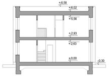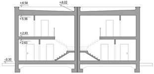 Ściany: bloczek silka E24 24cm + ocieplenie 20cm; Fundament: ławy; Stopy: lane - żelbet; Dach płaski kryty papą; Elewacja: tynk z akcentami kolorystycznymi