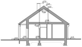 Ściany: porotherm 25cm + ocieplenie 20cm; Fundament: ławy; Stopy: lane - żelbet; Więźba drewniana, dwuspadowa; Pokrycie dachu-blacho na rąbek stojący; Elewacja: tynk i deski elewacyjne