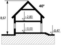 Dach: dachówka, kąt nachylenia 40°. Stropy: żelbetowe, wylewane. Ściany: 2-warstwowe - pustak ceramiczny + styropian. Ogrzewanie: gazowe, olejowe.